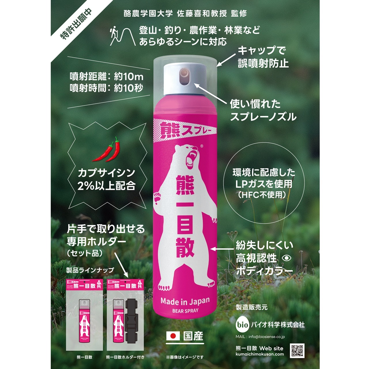 動物医薬品メーカー・バイオ科学(本社:徳島県)が、熊研究の第一人者・酪農学園大学の佐藤喜和教授と共同で研究開発を行い、現在、特許出願中の新商品。高品質かつ信頼性の高い国内製造により、安全性と実用性を兼ね備えた熊撃退スプレーです。