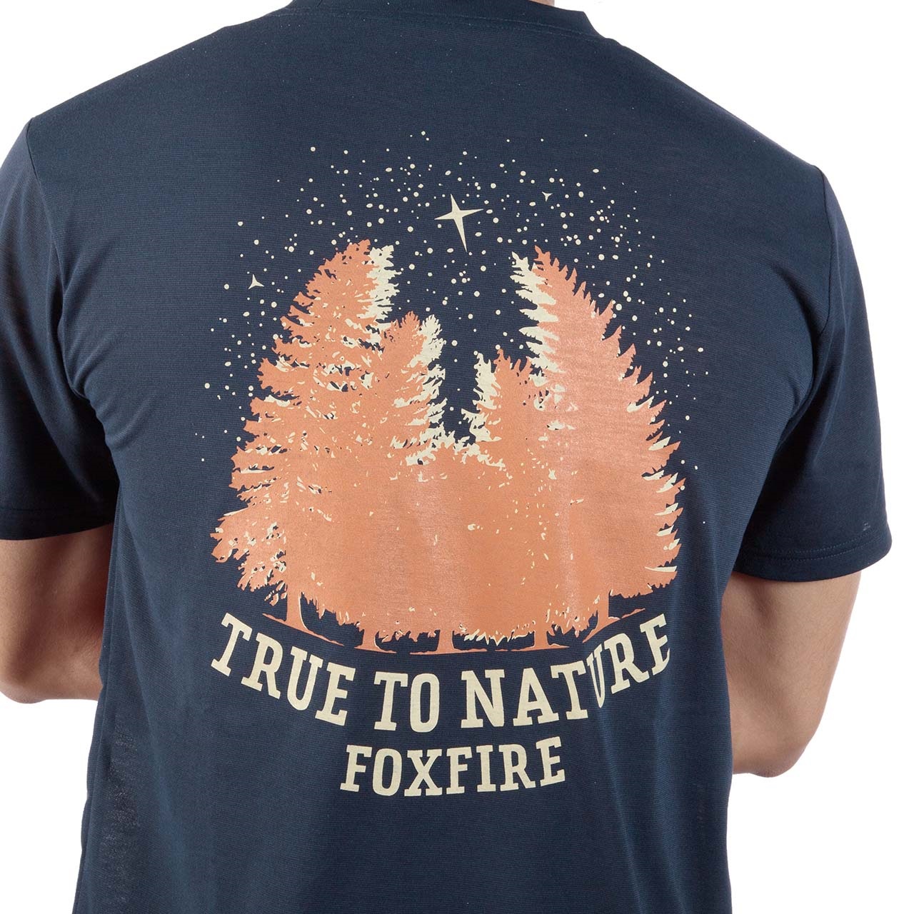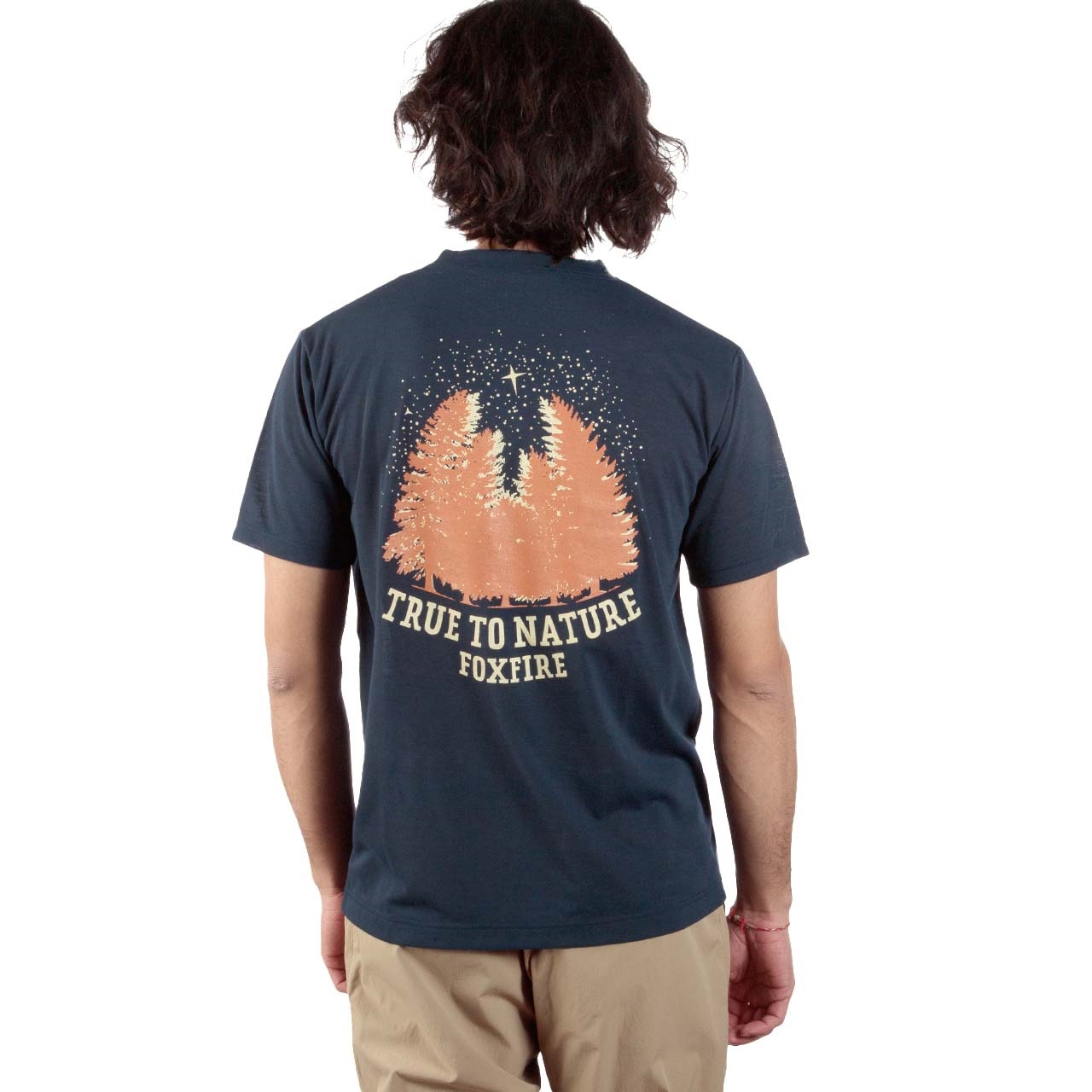 - 暗い森の上空を道しるべのように照らす星をモチーフにしたイラストをバックプリントたTシャツ。
