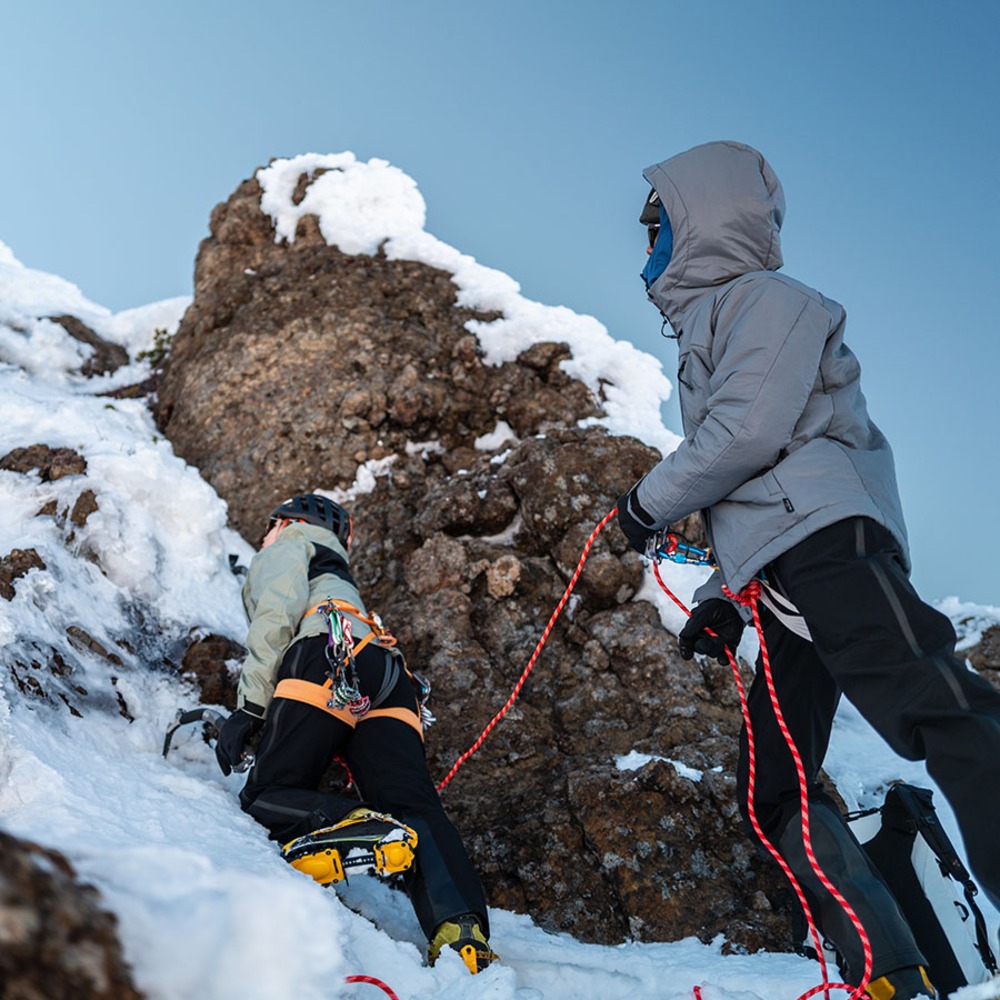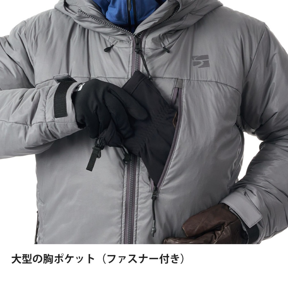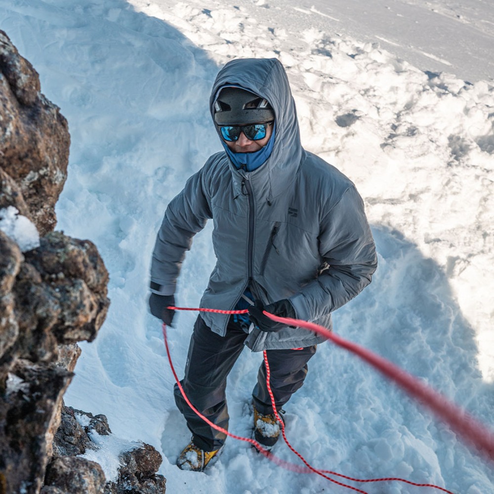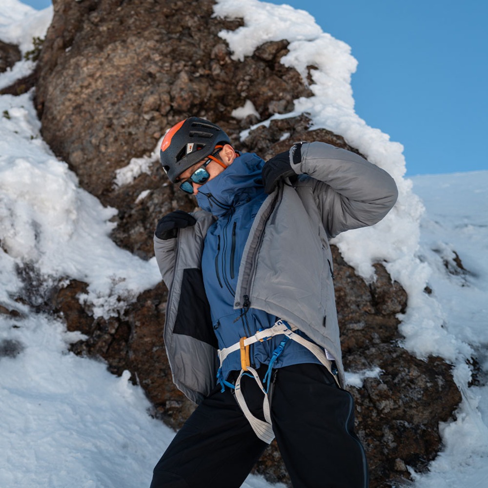 保温素材には、濡れてもロフトを維持しやすい高機能なファインポリゴン®を身頃に6枚、袖に4枚とたっぷり封入。雪や氷で濡れても冷えにくく、長時間の静止が求められるビレイ中でも、しっかりと体温を保持します。