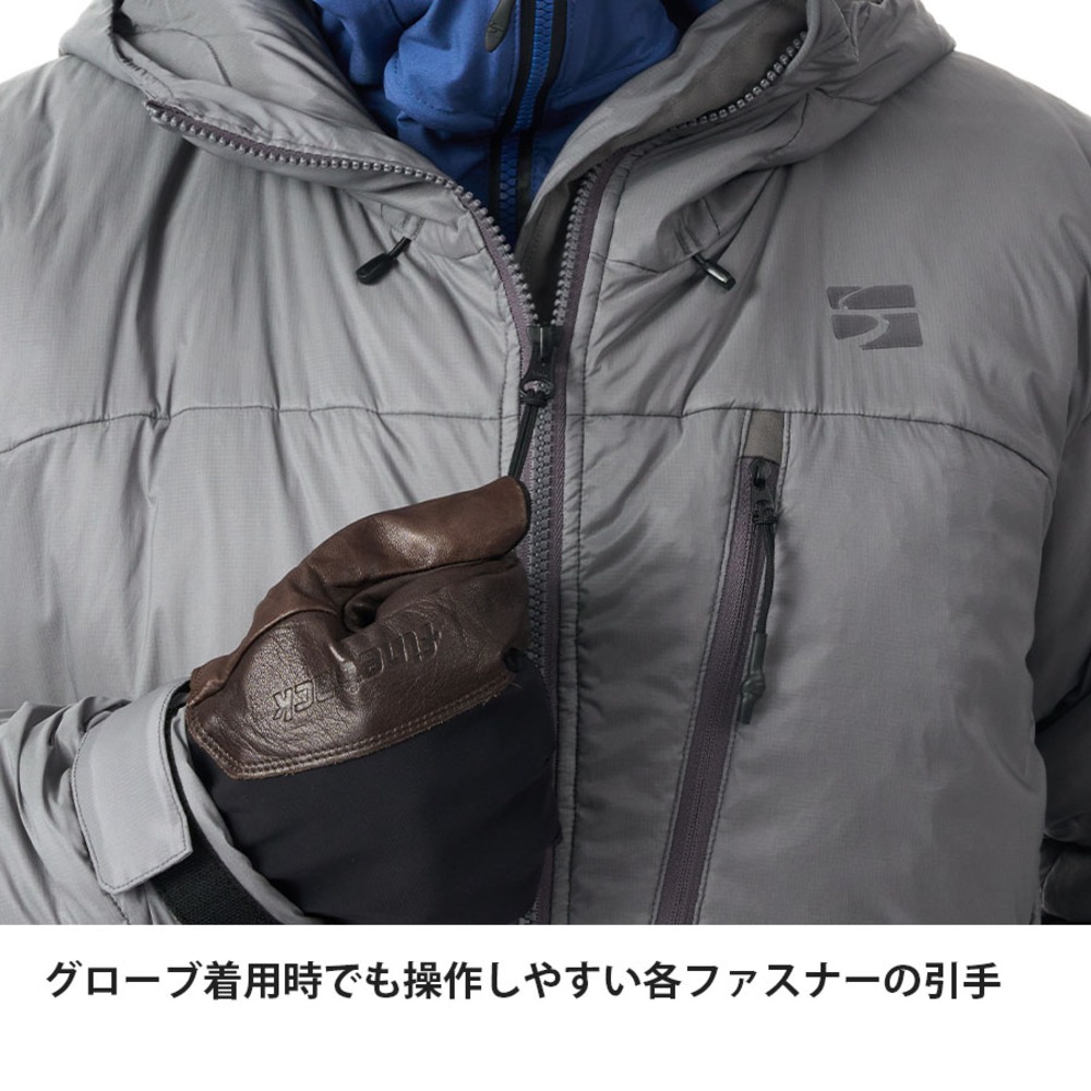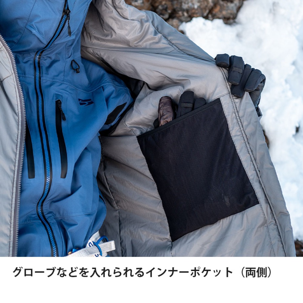 また、シンプルな設計で450gという軽さを実現。携行性に優れたビレイパーカーとしてはもちろん、雪山でのテント泊や雪洞泊などのシーンに防寒アウターとして活躍します。