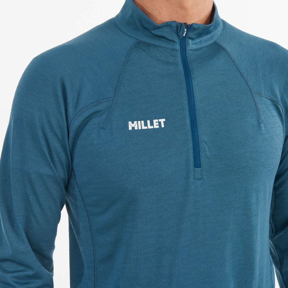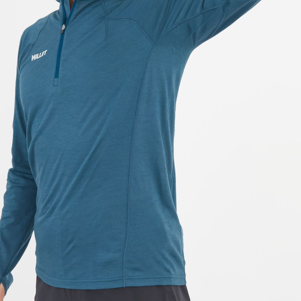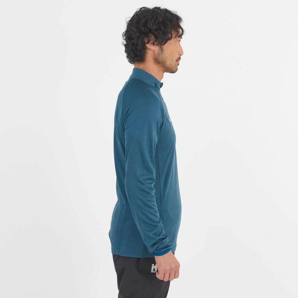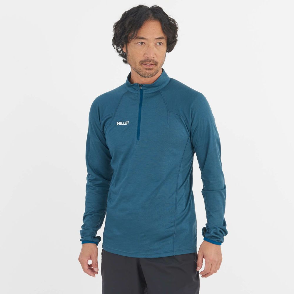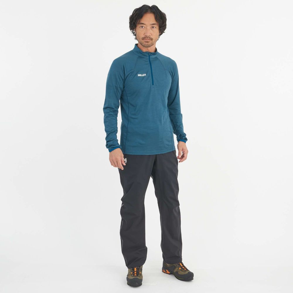 トレッキングからアルパインクライミングまで幅広いアウトドアアクティビティに対応する、ロングスリーブの快適ベースレイヤー。リサイクルポリエステルの速乾性と耐久性、メリノウールの自然な着心地のよさ、天然の保温、調湿、防臭性など、双方のメリットを合わせもったウール混紡素材を採用。さらに動きやすさとリュックとの干渉を考慮した巧みなカッティングによって、長時間の登山やハイキングでのストレスを軽減し、山岳での快適な行動を最大限サポートします。発汗時にジッパーを大きく開けて換気性を高めることができるハーフジップタイプ。