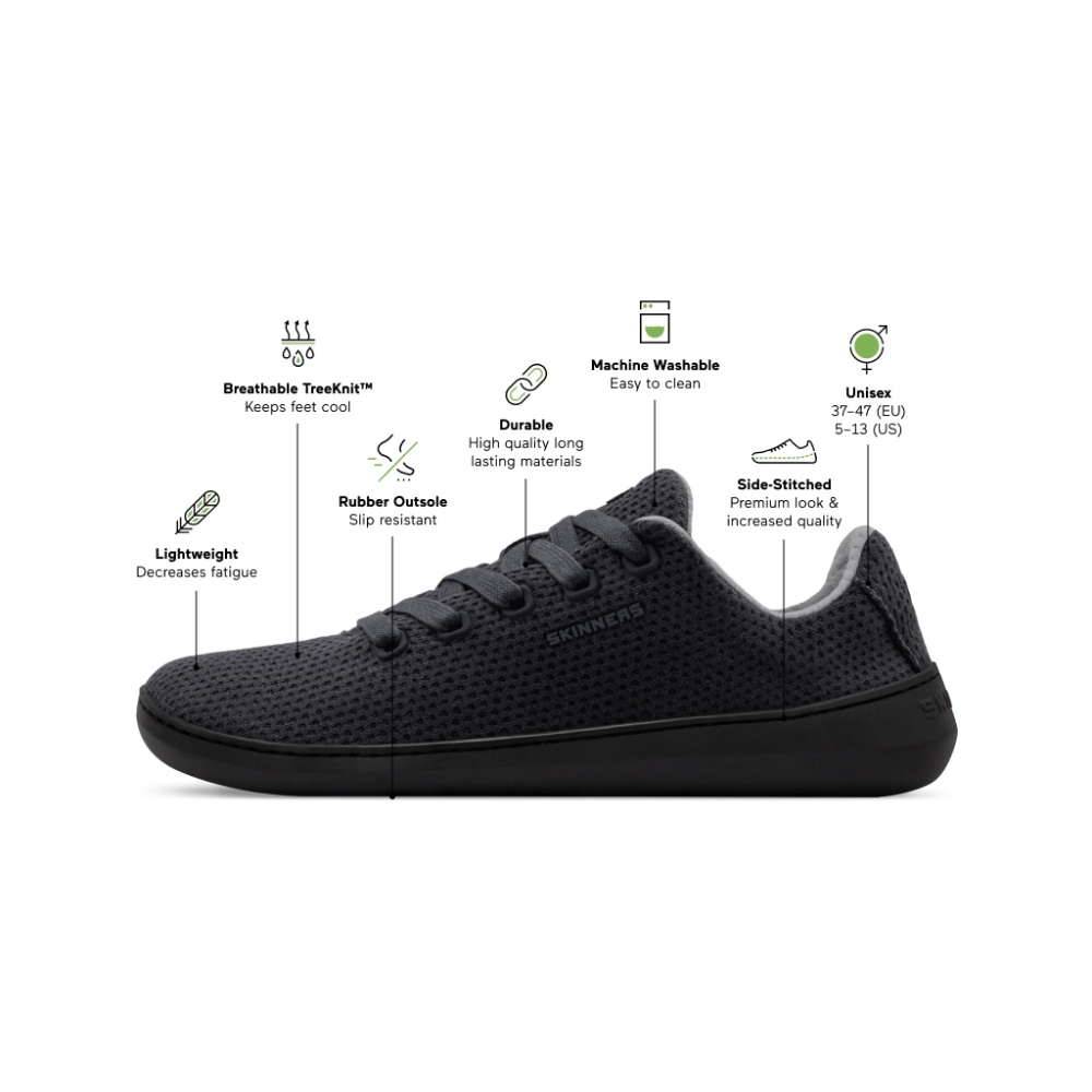 設計は、SKINNERSが掲げる4つのシンプルな原則に基づいて開発。わずか 4.5mm のラバーソールが足裏の固有受容体を刺激し、バランスの取れた自然な歩行をサポートします。ゼロドロップ構造により、姿勢も自然な状態へと導きます。