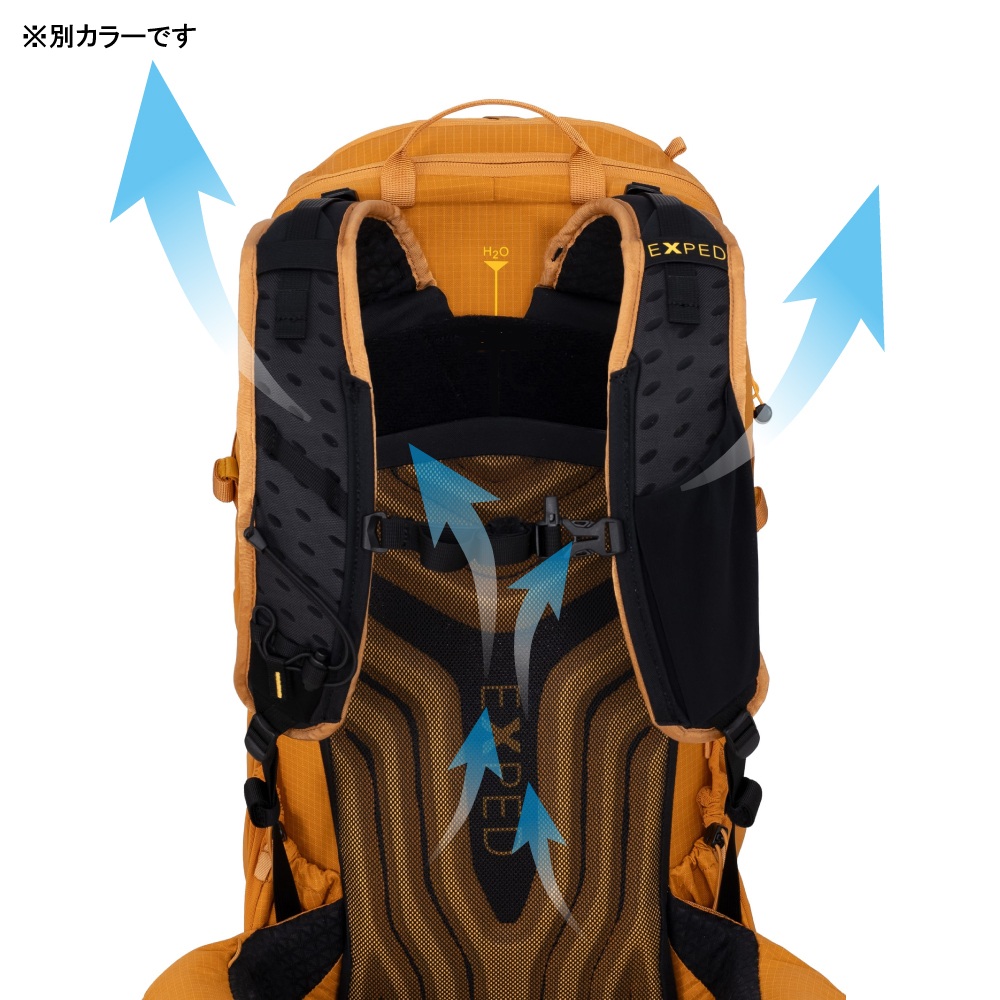 エアフローシステムは柔軟性があり、着用者の背中が自然に動くようになっています30Lと45Lのモデルには、より重い荷物を運ぶ想定で軽量スチールフレームが入っていて、背面長の長さが調節可能になっている。