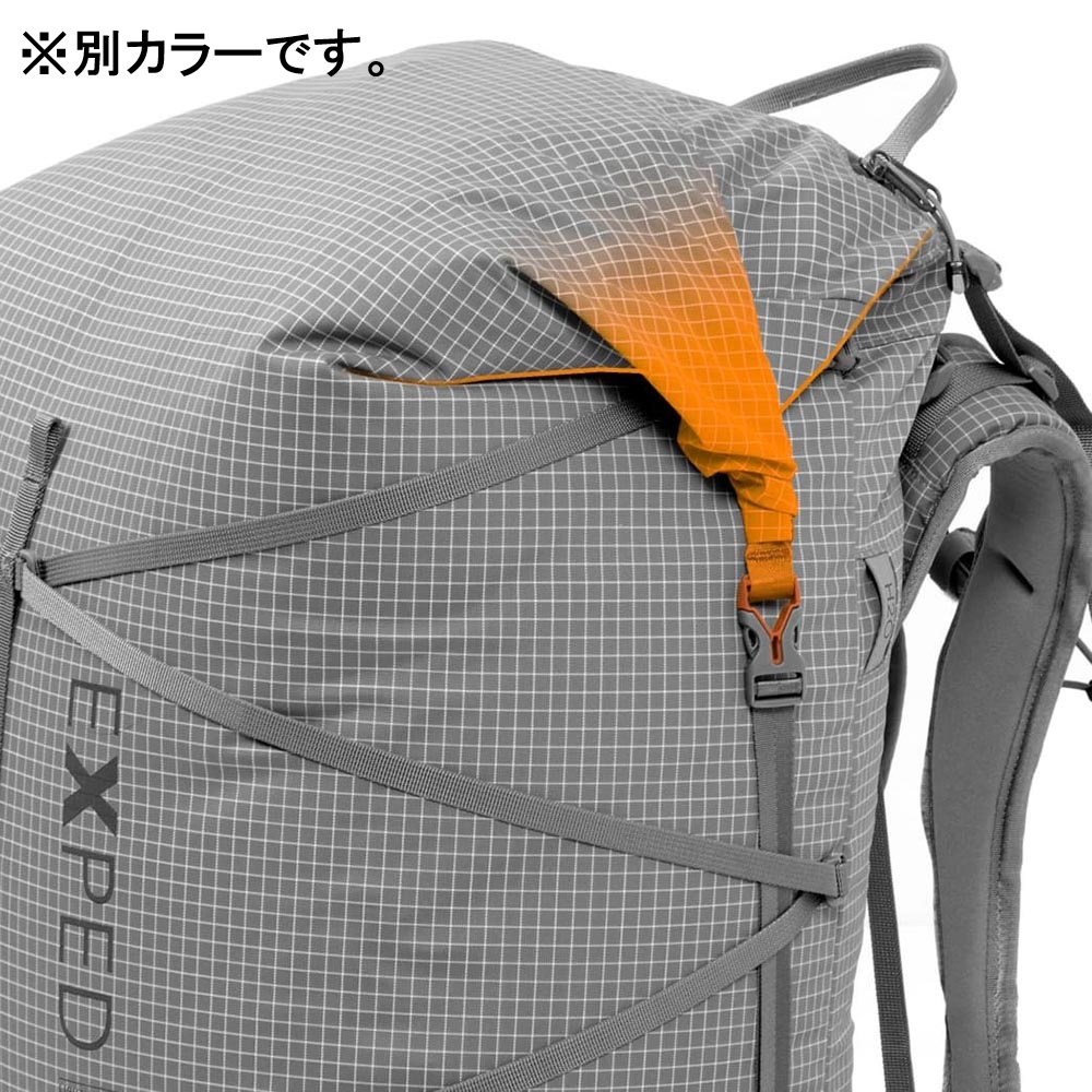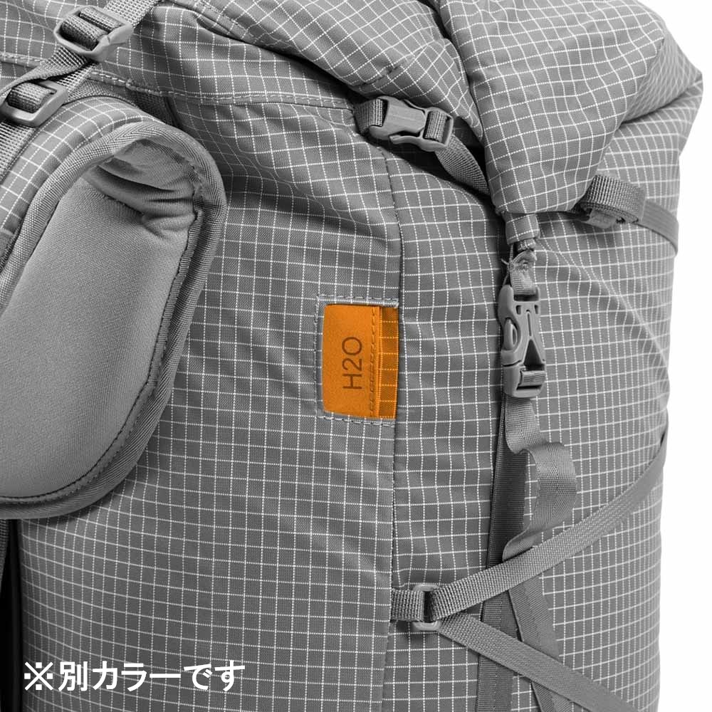 メインの開口部であるロールトップクロージャーは耐候性があり、必要に応じて容量を調節して追加のギアを収容することができます。フック付きのストラップとジグザグのサイドコンプレッションストラップを使えば、口を閉じた状態の上にクライミングロープ等の荷物を固定することができます。