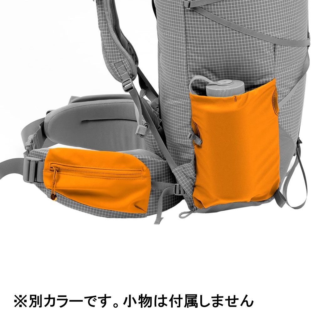 両サイドにあるストレッチメッシュポケットには、水筒やトレッキングポールが収納でき、ヒップベルトにあるジッパー式ストレッチポケットには、行動食や携帯電話などの小物を収納できます。上部の耐水ジッパー付きポケットは、貴重品を収納するのに便利です。