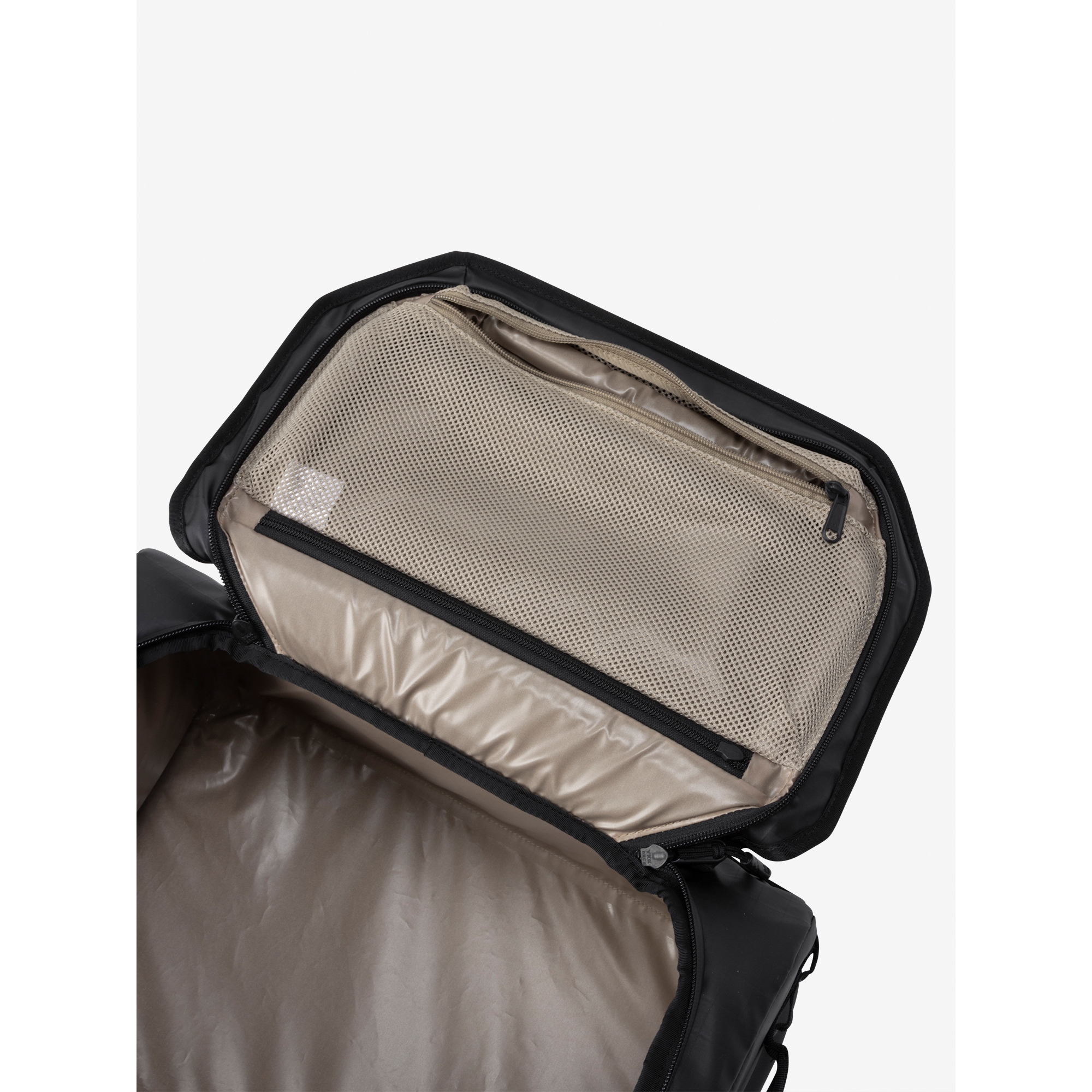 メイン素材に耐水性と耐久性をもつ300デニールのリサイクルポリエステル(TPEラミネート)を採用し、ボトム素材にはタフな420デニールのリサイクルナイロンを配置。持ち運びに便利なグラブハンドルをサイド4面に備え、ウィーラーハンドルに通せるテープ付きで、スタイルに合わせてスムーズに移動できます。