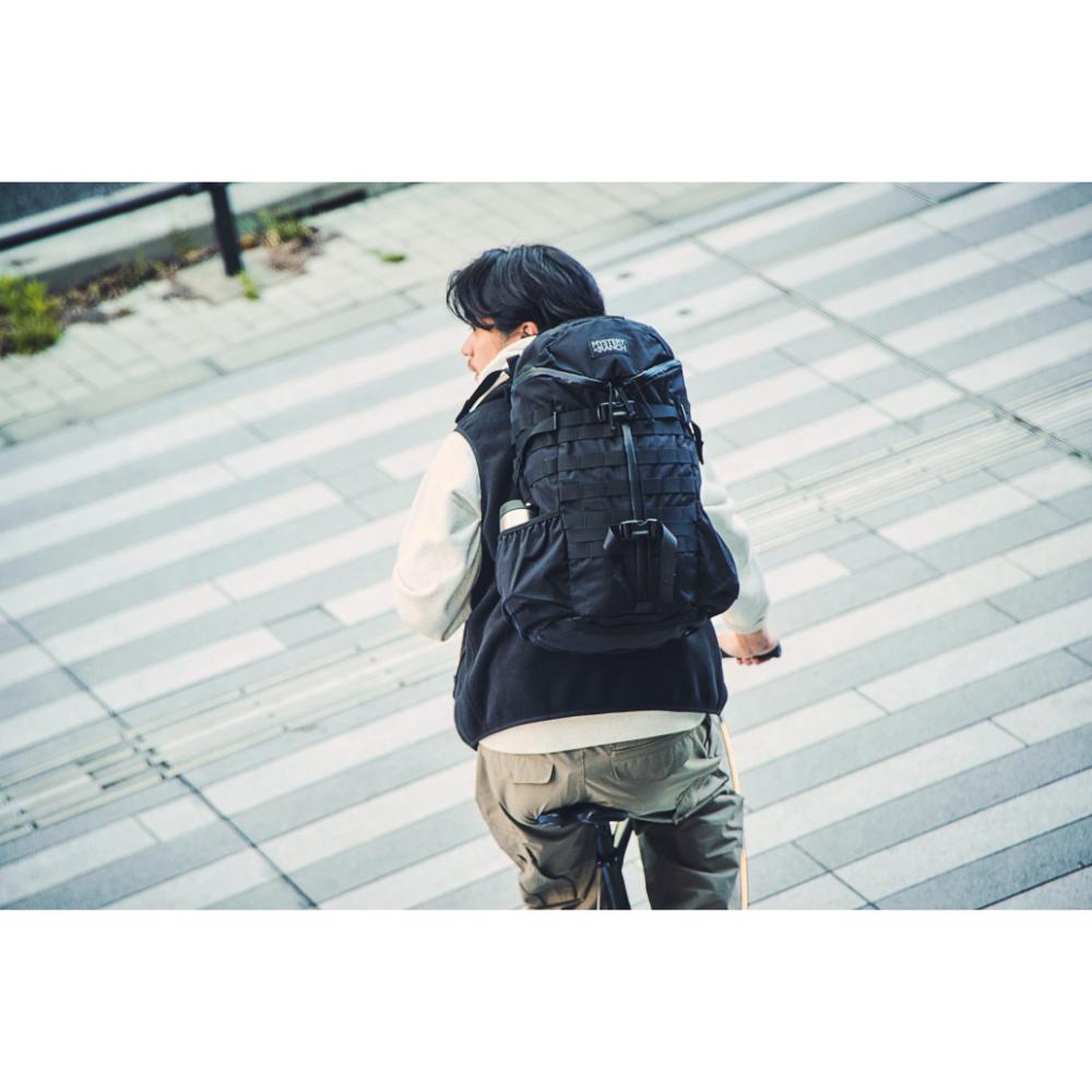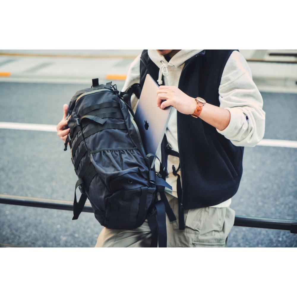 MOLLEシステムなどミリタリー由来のディティールも残しつつ、内部にはPC/ドキュメントスリーブが採用されサイドジッパーから素早い出し入れが可能です。背面調整が可能なフューチュラヨークシステムを搭載し、脱着可能なウェストベルトが付きます。27リットルの容量は日々のビジネスからご旅行、日帰りのトレッキングやハイキングにも対応した汎用性の高いバックパックと言えるでしょう。