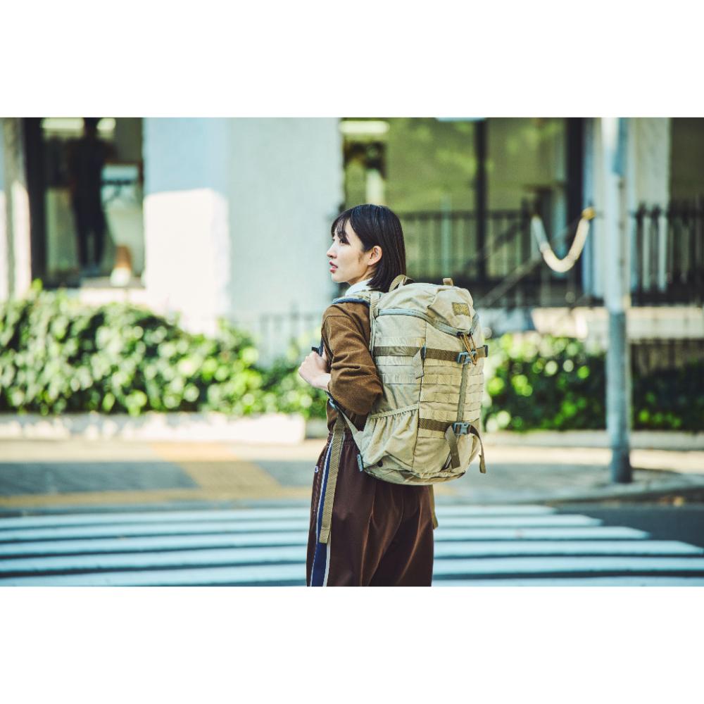 MOLLEシステムなどミリタリー由来のディティールも残しつつ、内部にはPC/ドキュメントスリーブが採用されサイドジッパーから素早い出し入れが可能です。背面調整が可能なフューチュラヨークシステムを搭載し、脱着可能なウェストベルトが付きます。27リットルの容量は日々のビジネスからご旅行、日帰りのトレッキングやハイキングにも対応した汎用性の高いバックパックと言えるでしょう。