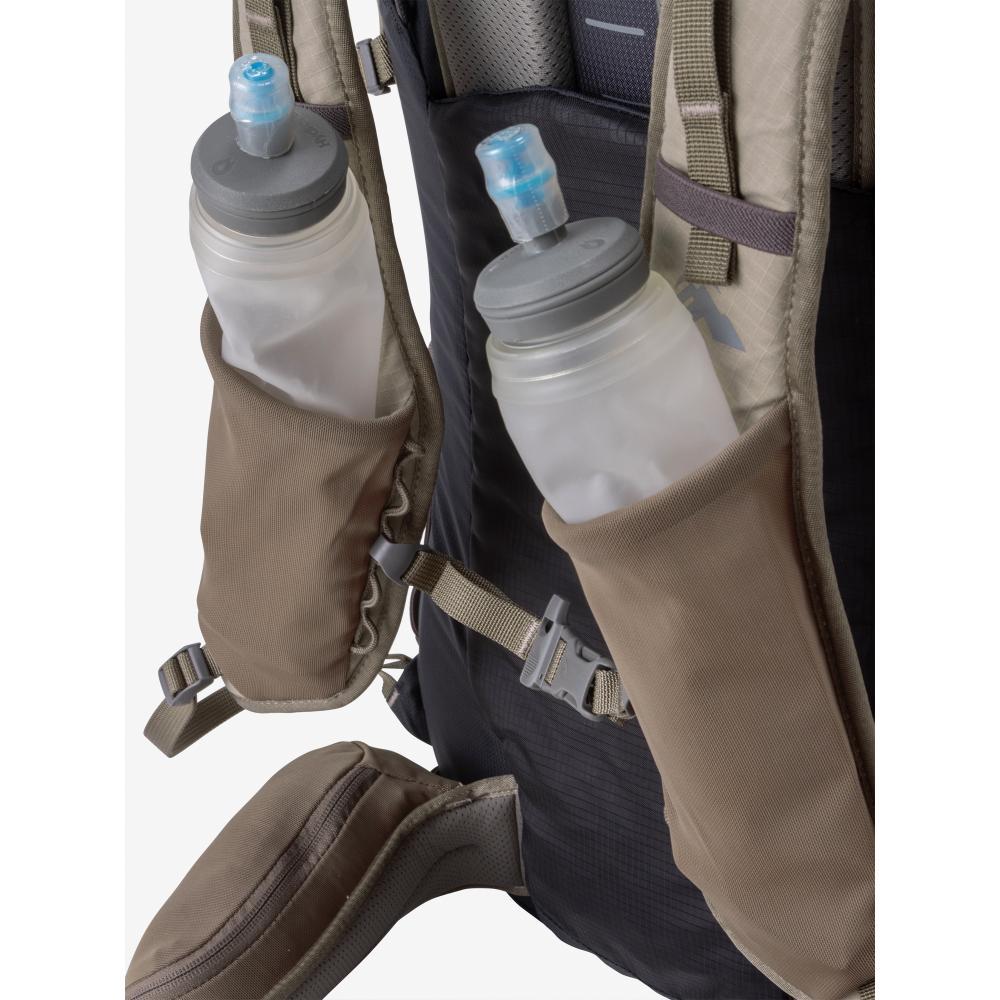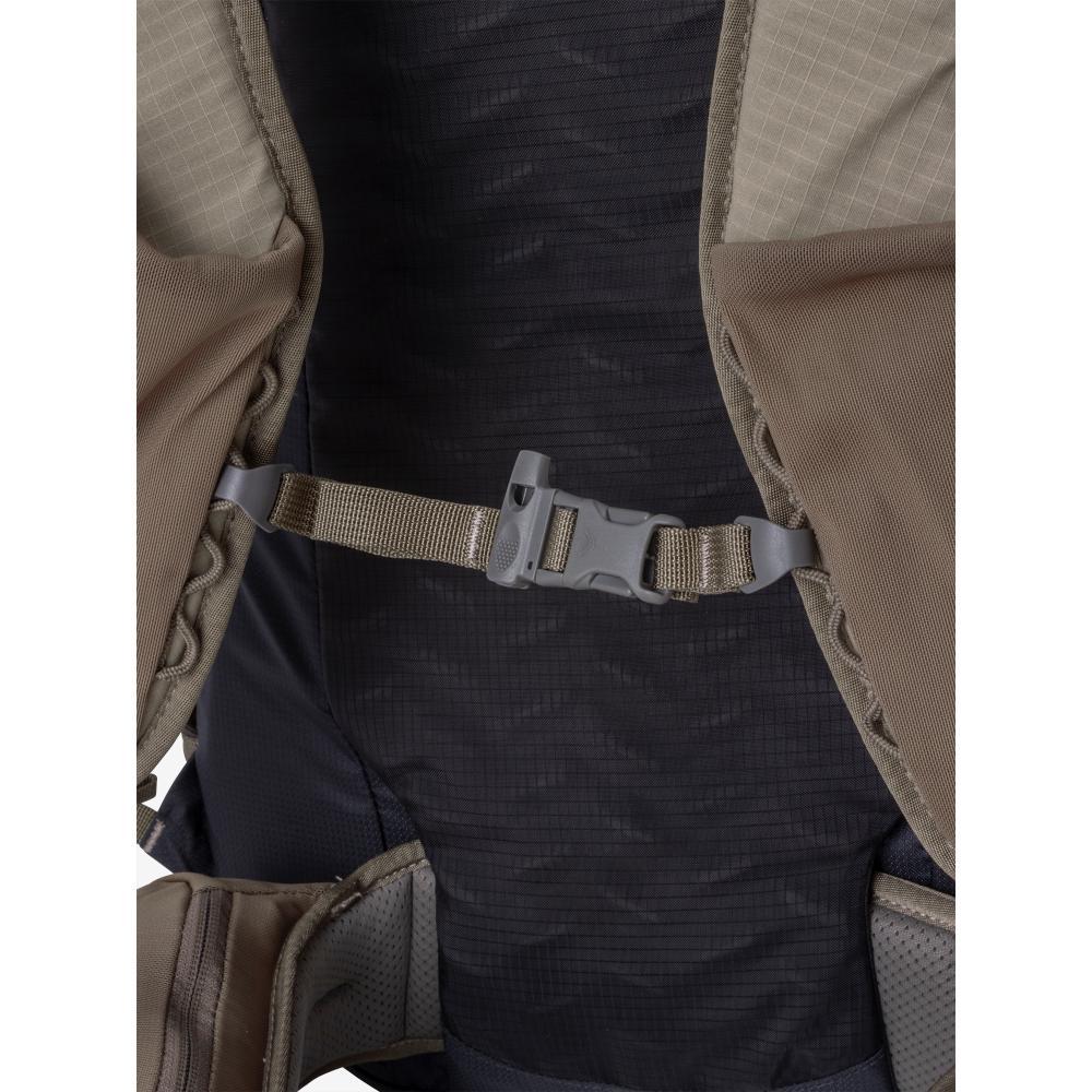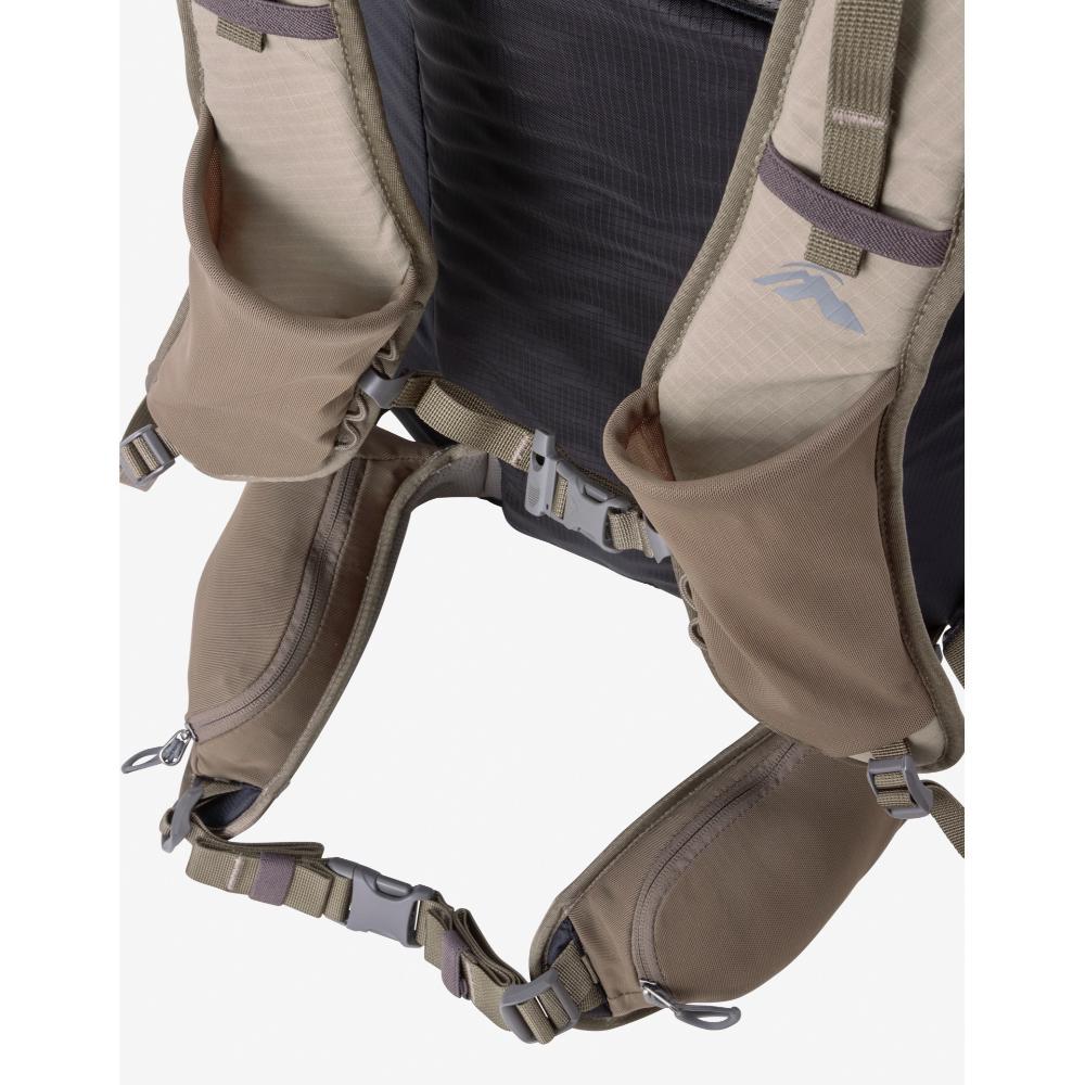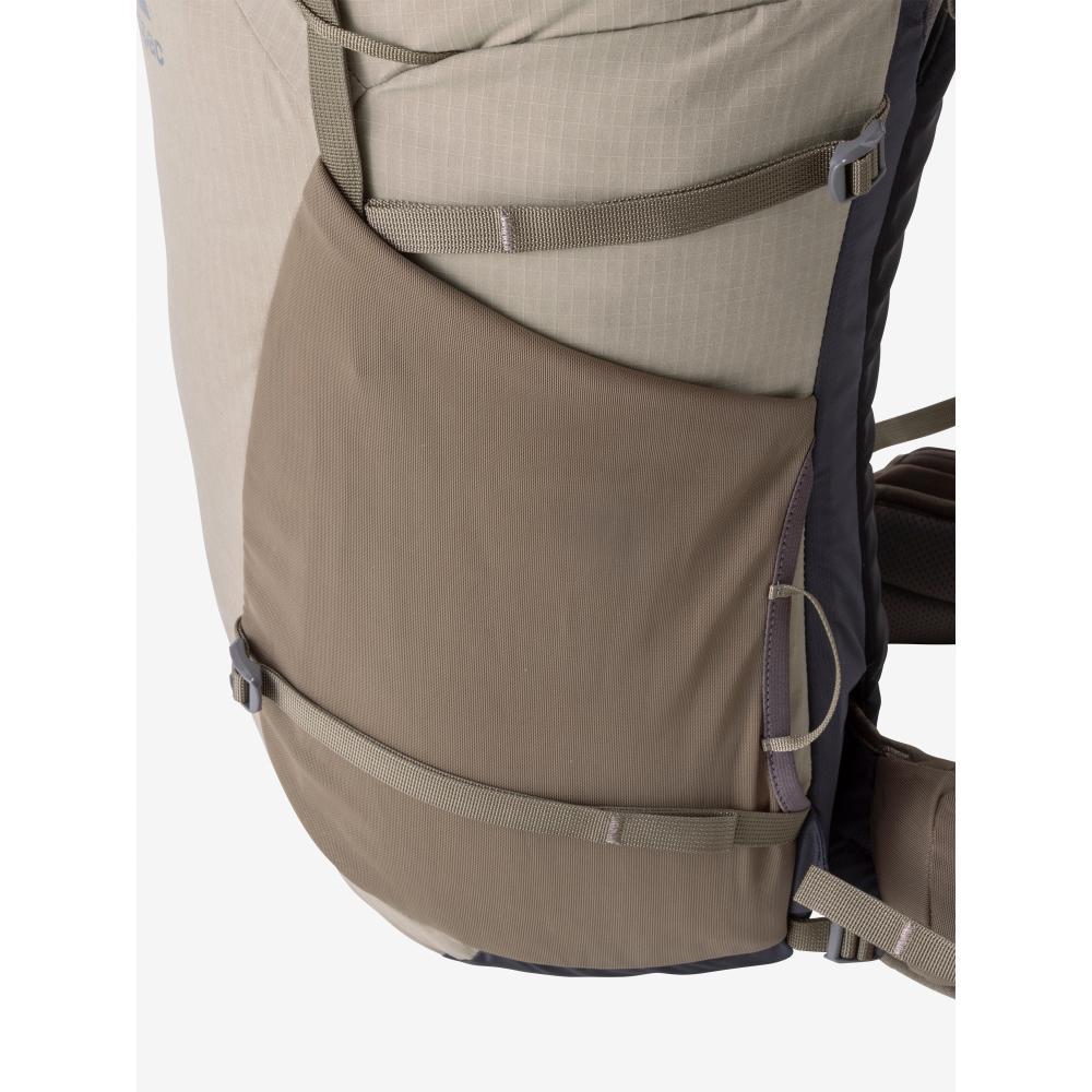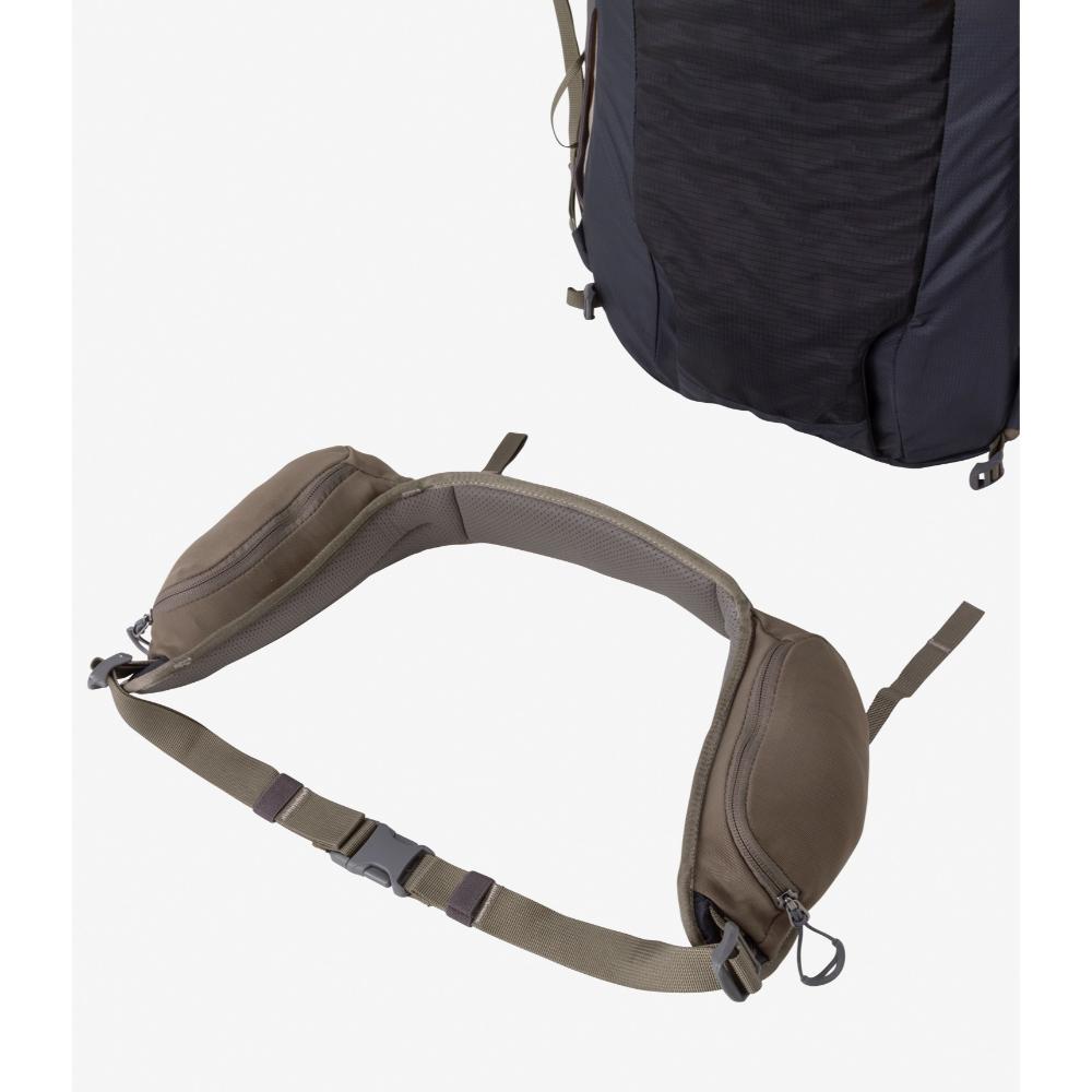 本体は取り外し可能な雨蓋を備え、ロールトップオープニングで本体内部へアクセスします。トップリッド、ウエストベルト、内部のアルミフレームは取り外し可能で、様々なスタイルに合わせられます。小物の収納に便利なフロントのファスナーポケット、トレッキングポールなど長物の収納に対応するサイドメッシュポケット、ほとんどの500mlボトルを収納できるショルダーハーネスのメッシュポケットなど充実の収納力。縦走登山やロングトレイルなど長期の山行に活躍する大型バックパックです。