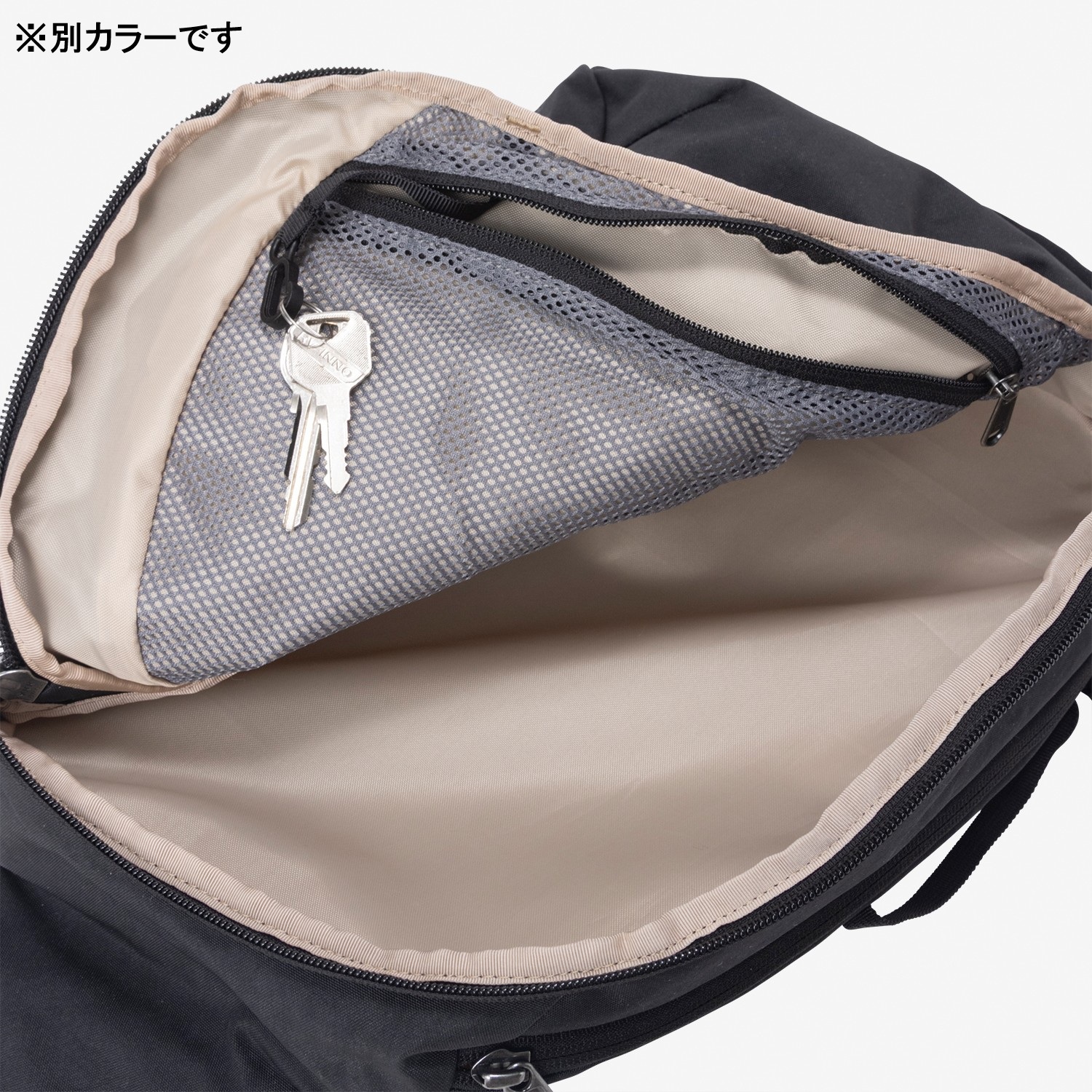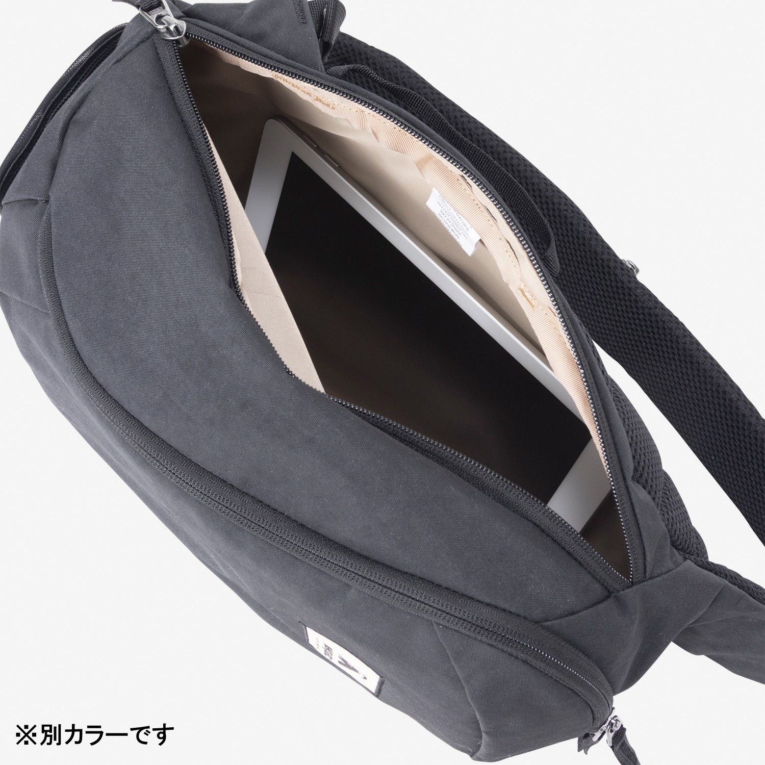 素材には、耐久性と耐水性を備えたリサイクルオックスフォードナイロンを採用しています。本体内部に、11インチまで対応可能なタブレット用ファスナーポケットを備えています。ショルダーストラップのファスナー付きポケットは、スマートフォンやカギなどの収納に便利。ボトムにはボトルポケットも装備しています。