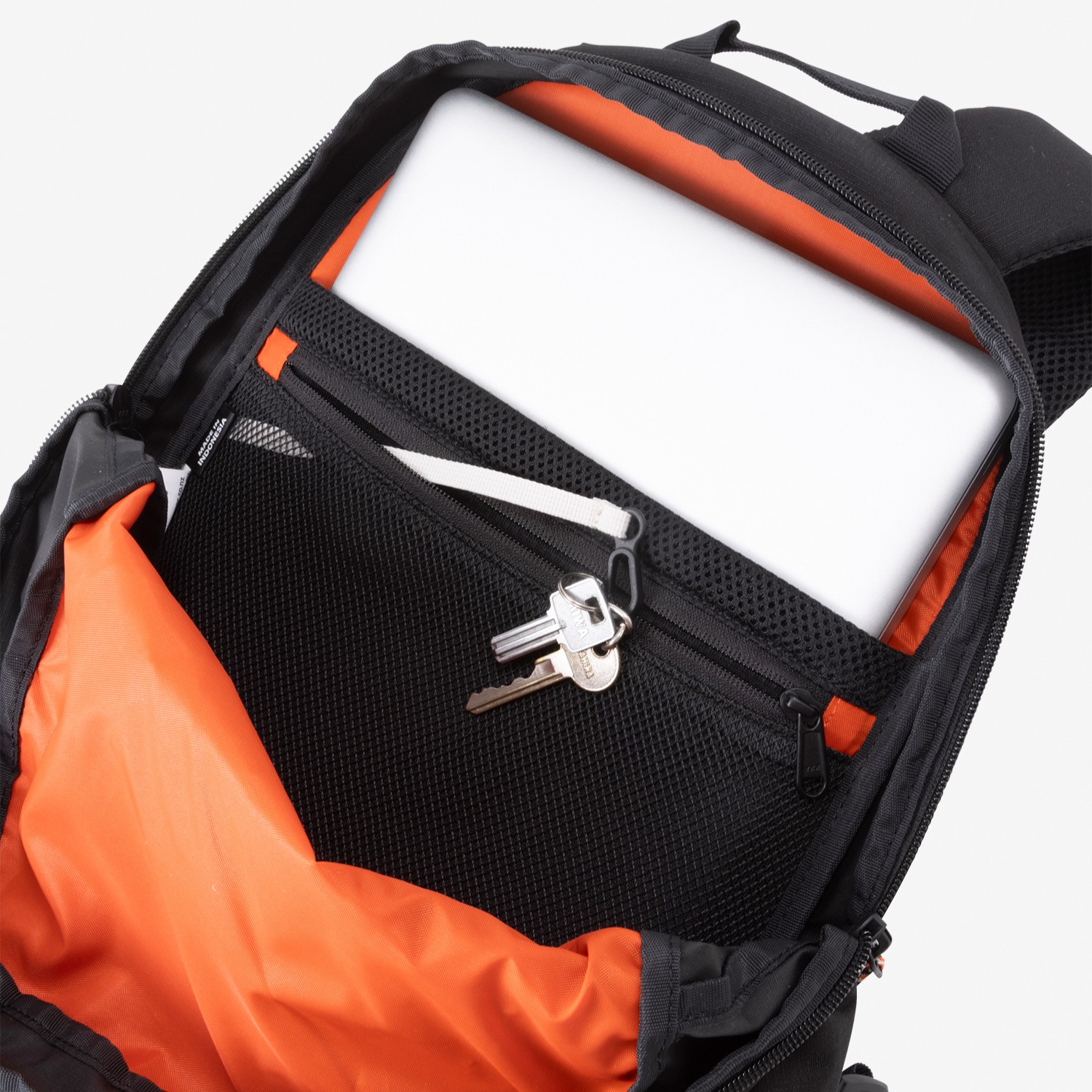 本体内部の背面には、14インチまで対応するPCスリーブと、キークリップ付きのファスナーポケットを装備。