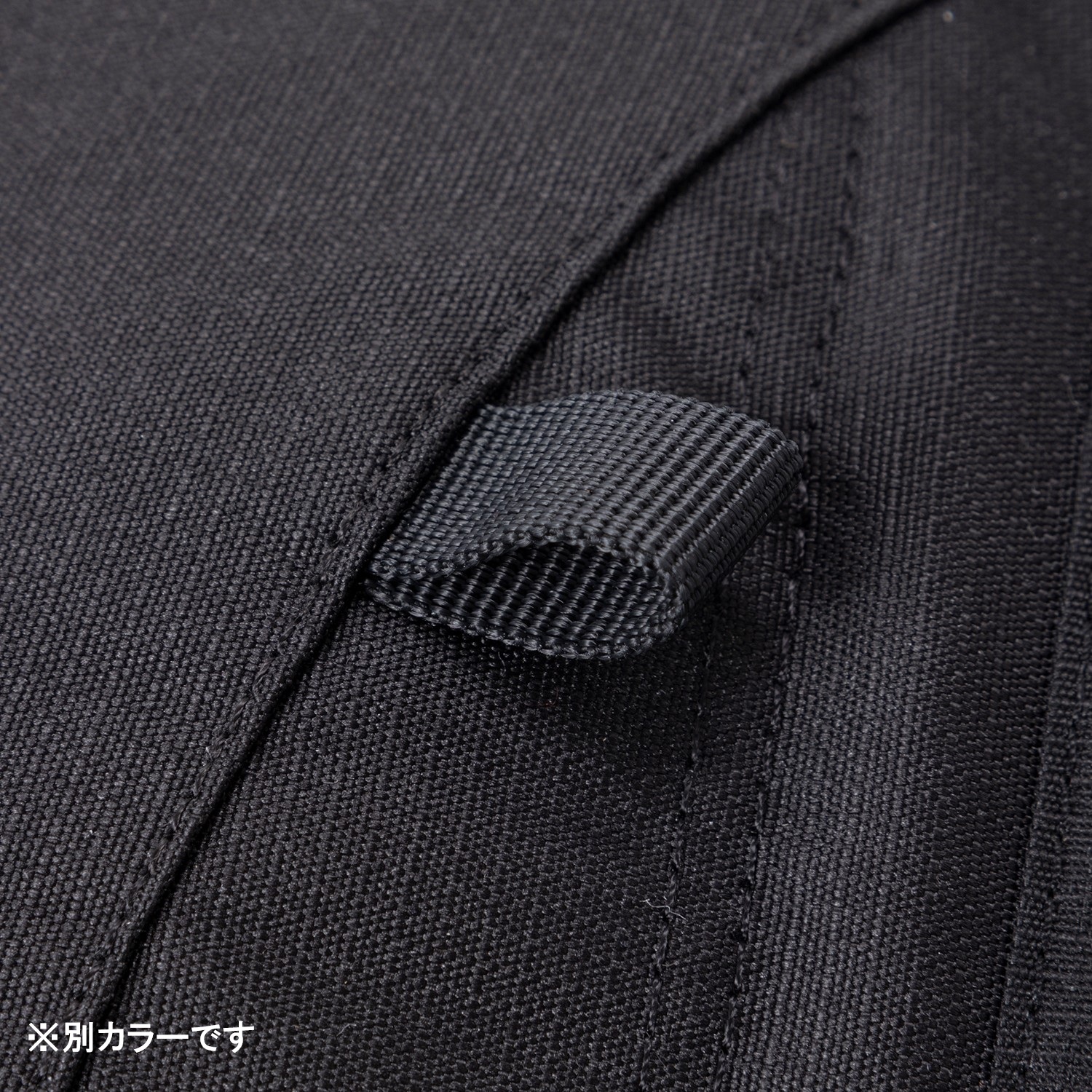 フロントには小物の収納に便利な縦型ファスナーポケット、正面左サイドにはボトルなどを収納できるメッシュポケットを備えています。