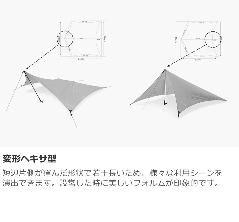 NANOタープがさらに軽く、 最小重量 260 g。ユニークな変形HEXA型の美しいシルエットは想像力を掻き立て、タープ泊・ハンモック・テント前室拡張など、多彩なスタイルを演出できます。またHEXAは風が抜けやすく耐風性にも優れています。