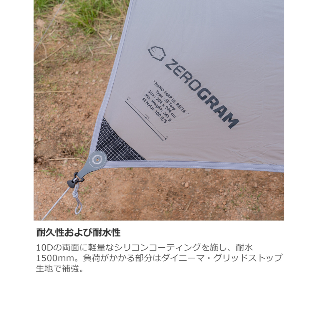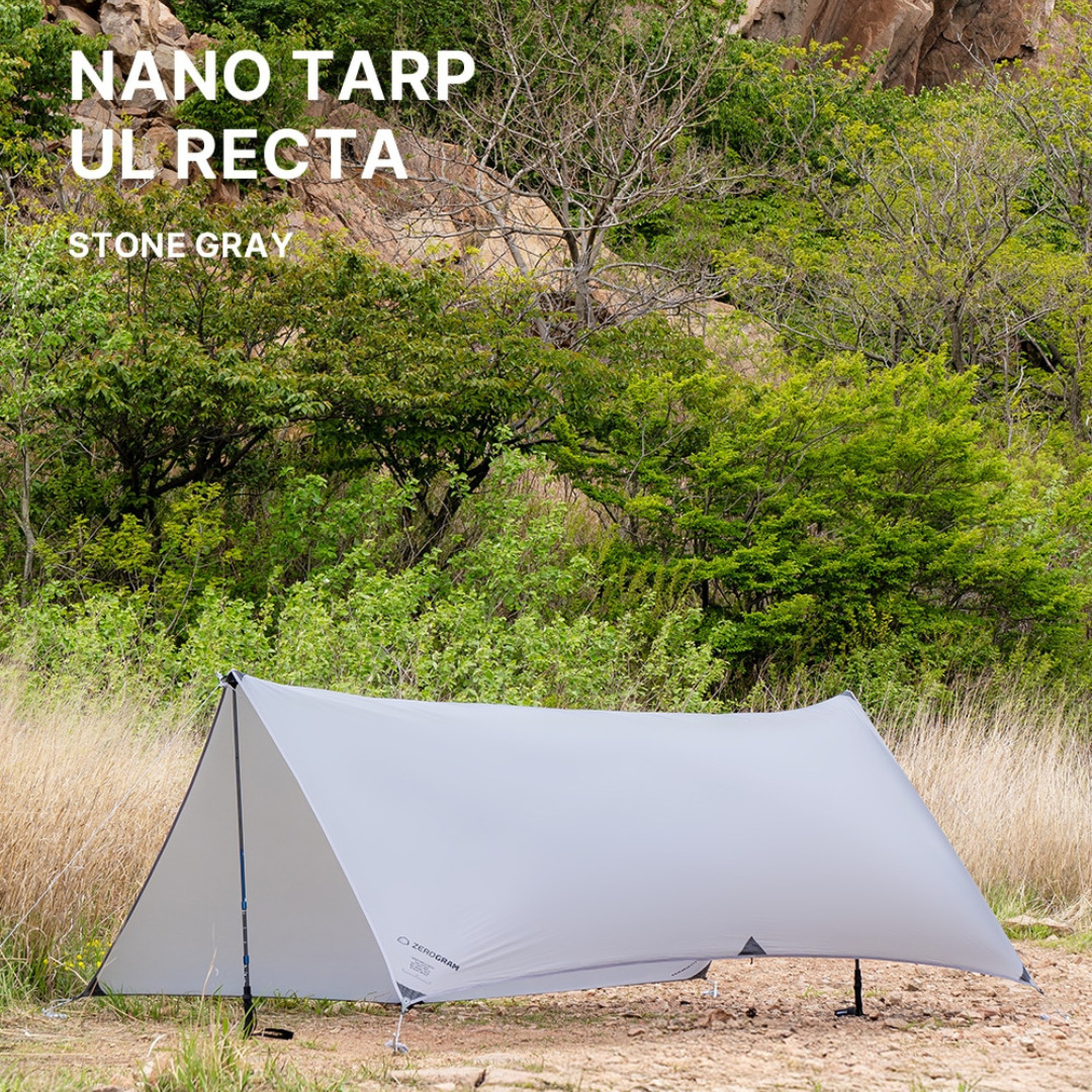 NANO タープにレクタ型が登場。最小 341g、長方形レイアウトならではの居住性と多用途性を両立しました。