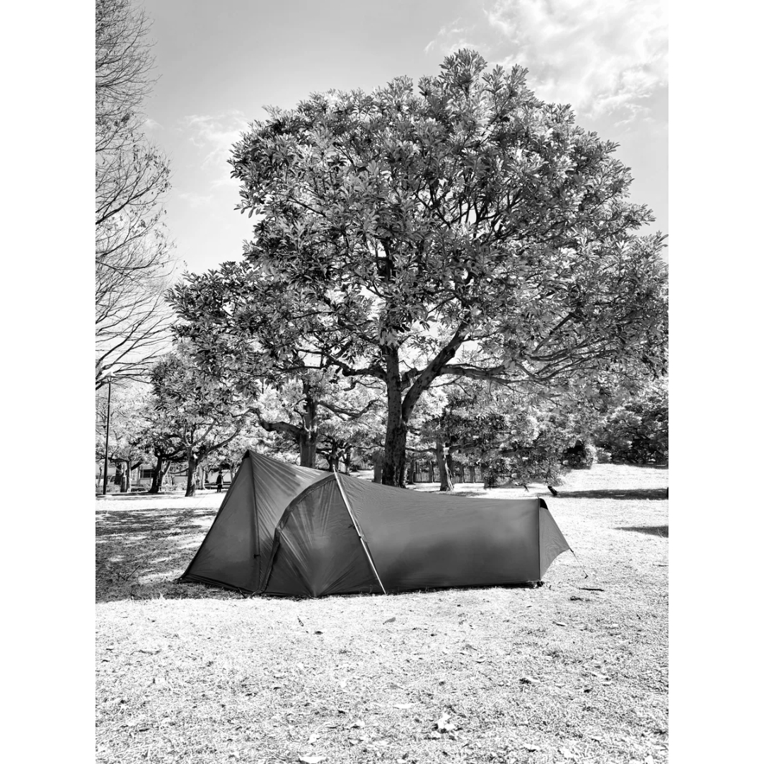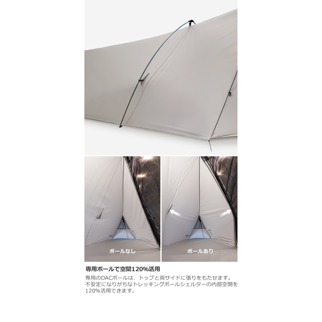 さらに専用DACポールを本体に付ければ居住空間を120%利用しながら自立型テントのような安定性が得られます。前後のガイラインループと前室一体型のフロントは利用シーンに応じた居住空間を作れます。