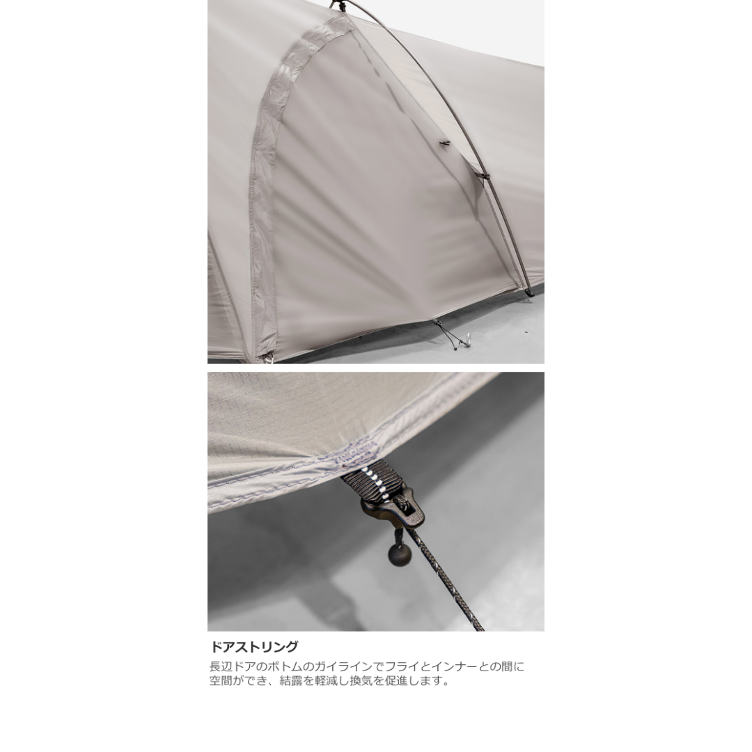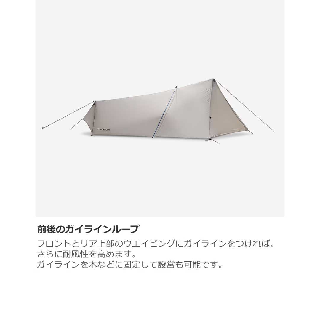 本体のみでもZEROGRAMらしい快適な空間に。軽量ながら簡単に設営撤収ができ悪天候でも安心です。3箇所で換気でき、長辺とフロントにある出入口は機動力を高めます。