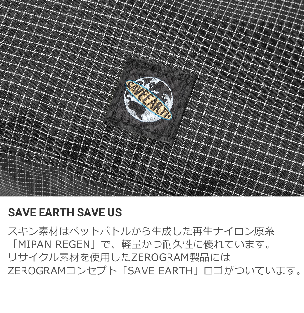 リサイクル素材を使用したZEROGRAM製品には、ZEROGRAMコンセプト 「SAVE EARTH」ロゴがついています。