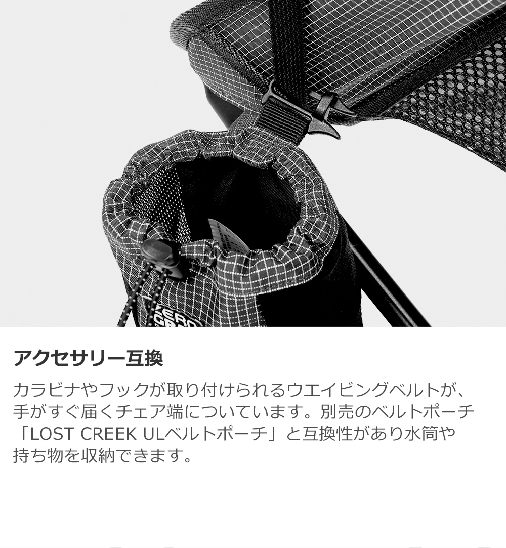 カラビナやフックが取り付けられるウエイビングベルトが、手がすぐ届くチェア端についています。 別売のベルトポーチ 「LOST CREEK ULベルトポーチ」 と互換性があり水筒や 持ち物を収納できます。