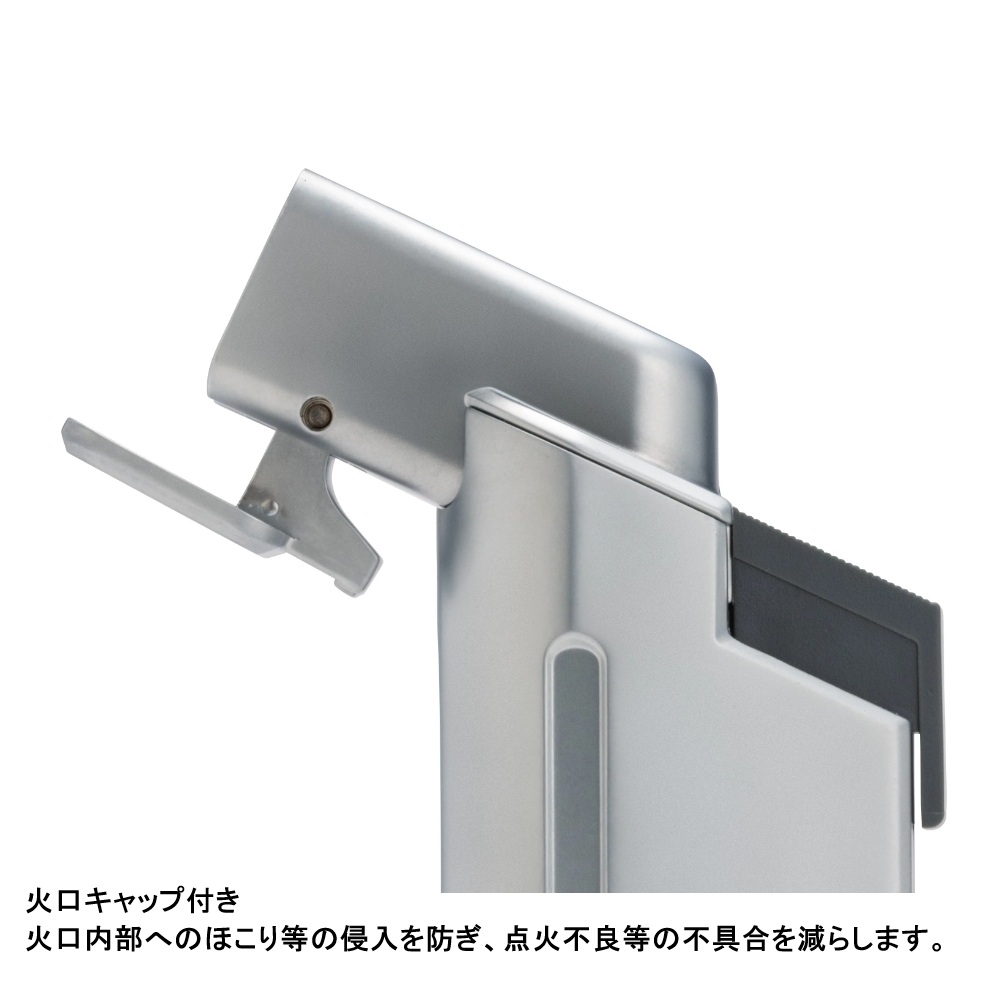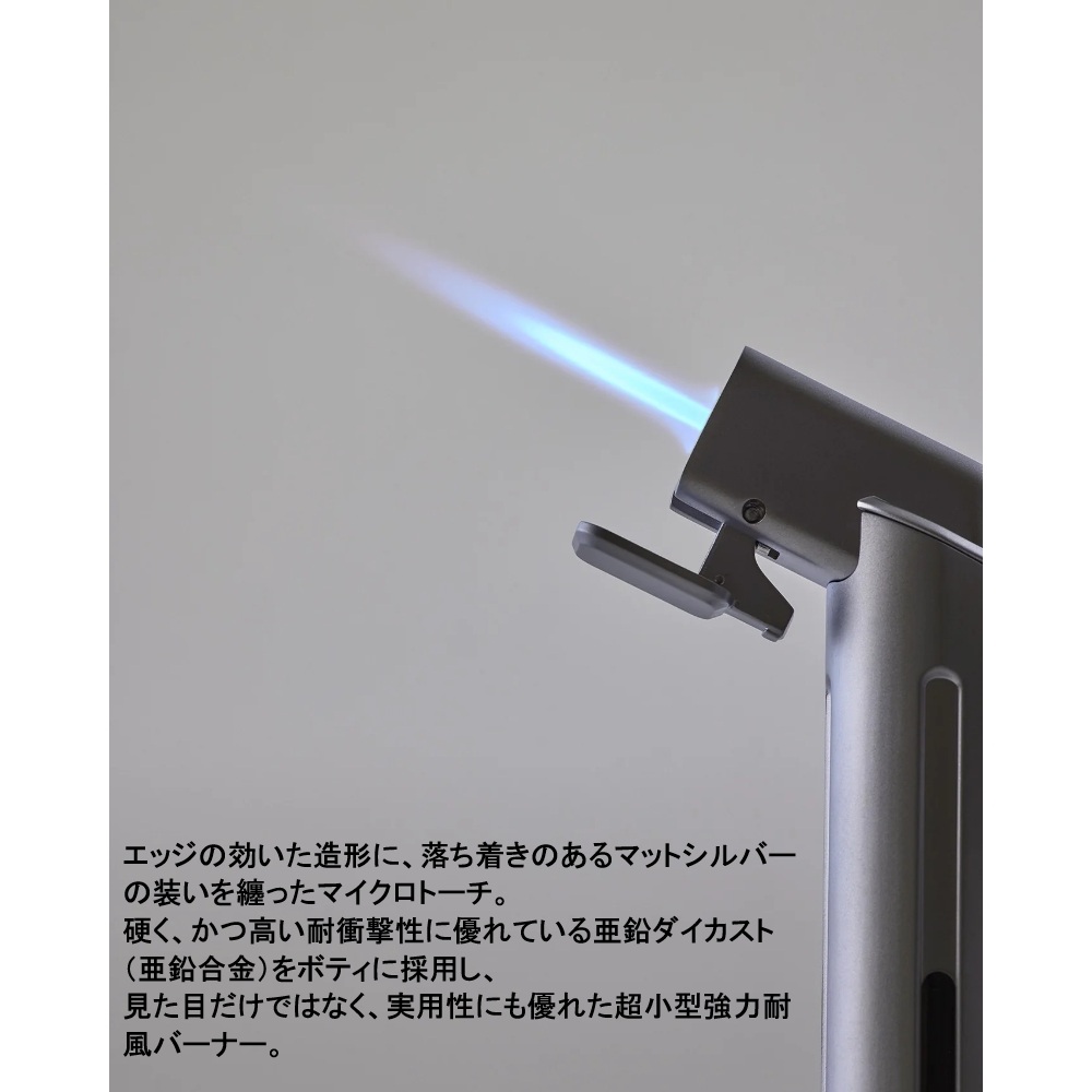 エッジの効いた造形に、落ち着きのあるマットシルバーの装いを纏ったマイクロトーチ。硬く、かつ高い耐衝撃性に優れている亜鉛ダイカスト(亜鉛合金)をボティに採用し、見た目だけではなく、実用性にも優れた超小型強力耐風バーナー。