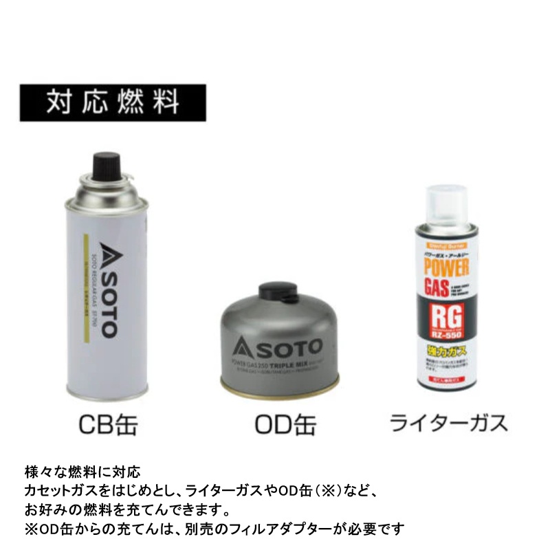 カセットガスをはじめとし、ライターガスやOD缶(※)など、お好みの燃料を充てんできます。