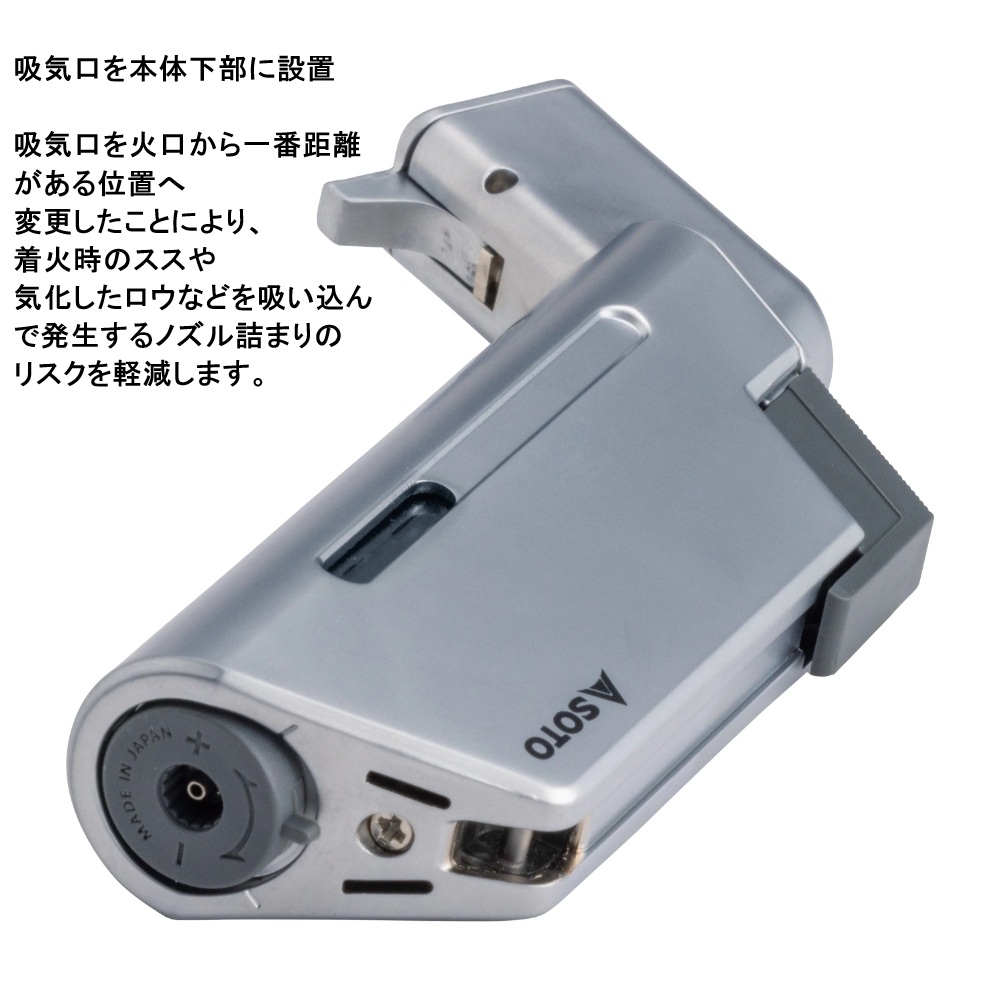 吸気口を火口から一番距離がある位置へ変更したことにより、着火時のススや気化したロウなどを吸い込んで発生するノズル詰まりのリスクを軽減します。