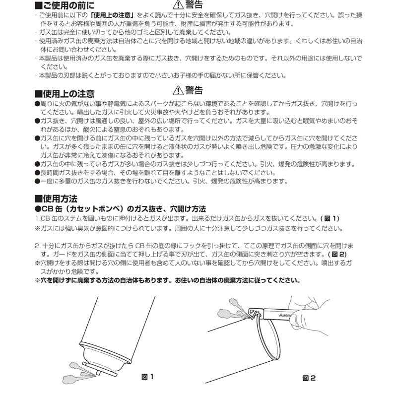 また、穴を開けずにガスを抜くこともできるため、廃棄方法に応じて使い分けが可能です。