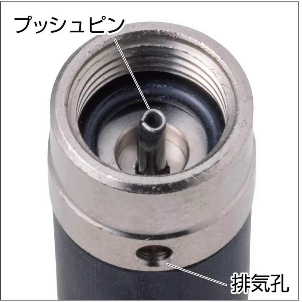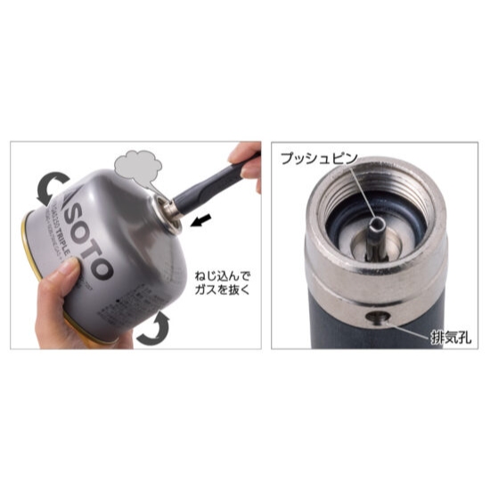 OD缶、ねじ込み缶からガスを抜くプッシュピン付き。穴を開けずにガスを抜くことができます。