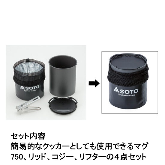 簡易的なクッカーとしても使用できるマグ750、リッド、コジー、リフターの4点セット