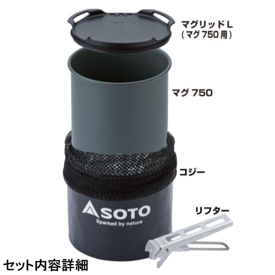 マグ750にはSOTO製シングルストーブ(別売)、ボンベ(別売:110缶)、リフターも収納可能。