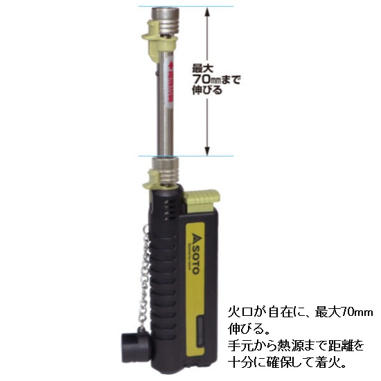 火口がのびる小型耐風バーナー。使用時は伸ばして安全に、収納は縮めてコンパクトに。