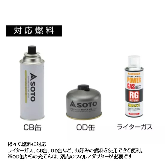 ライターガス、CB缶、OD缶など、お好みの燃料を使用できて便利。