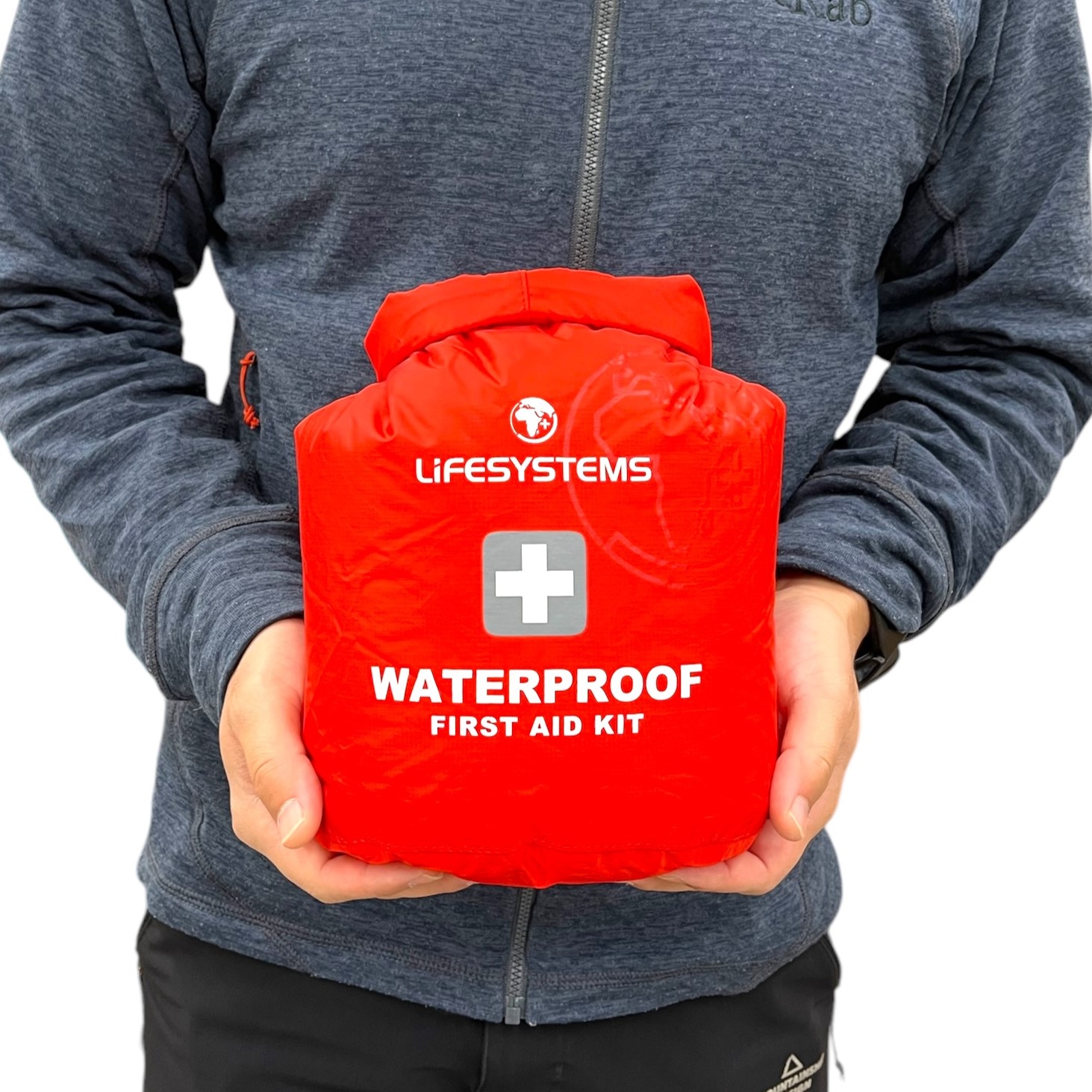 - 縫目をシームテープ処理した防滴ファーストエイドドライバック。誰が見ても一目でエマージェンシーバッグと判断できるレッドカラーと十字マークがポイント。