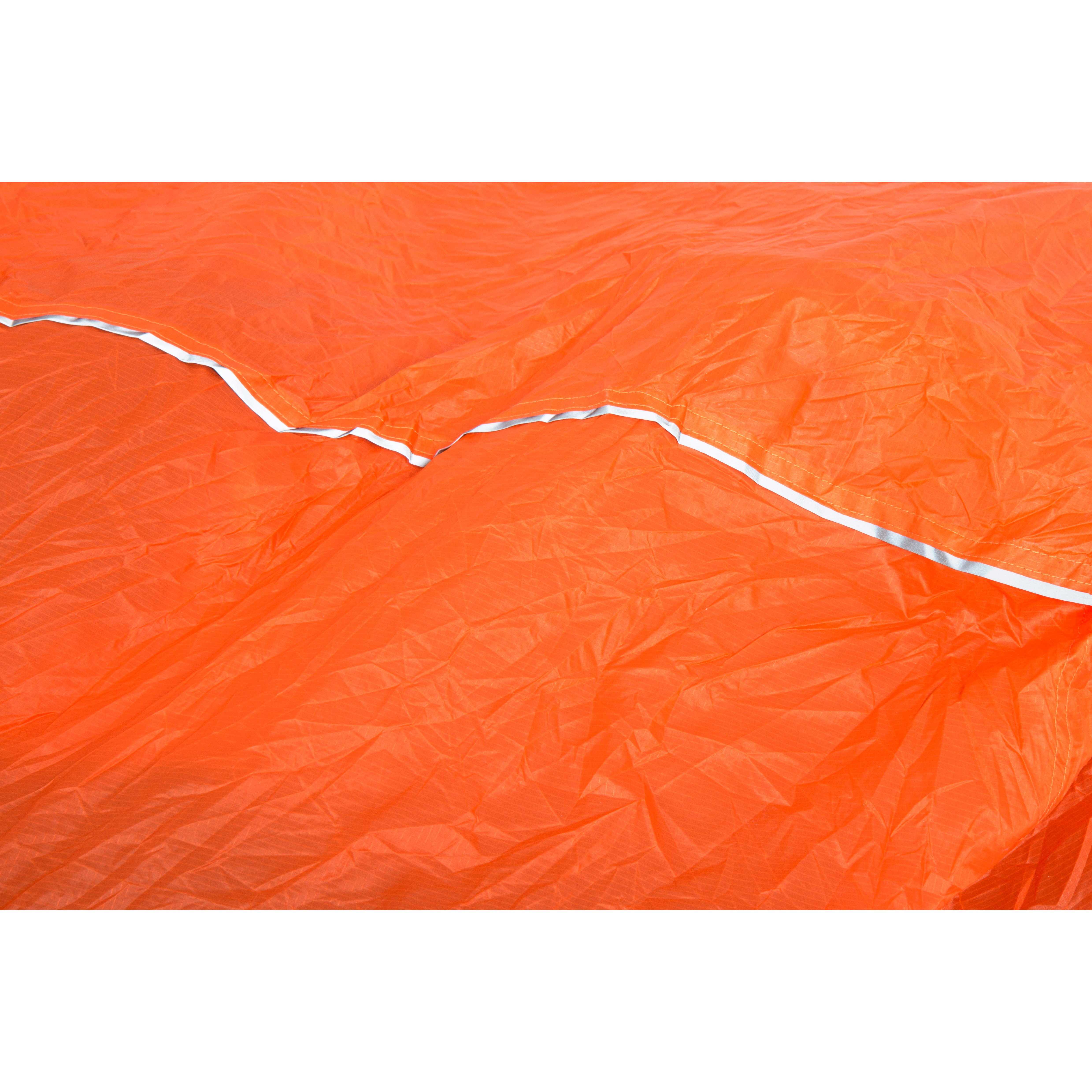 - 緊急用シェルター。使い方は非常に簡単。袋から取り出した状態で2~4名が中に入り、向かい合って座るだけで、風や冷気、雨から身を守ることができます。スタッフサックは通気用のメッシュパネルと、本体上部には反射シールがプリントされており、レスキュー隊員に居場所を知らせる役割を持っています。収納ケースは本体に取り付けられている為、紛失する心配がありません。