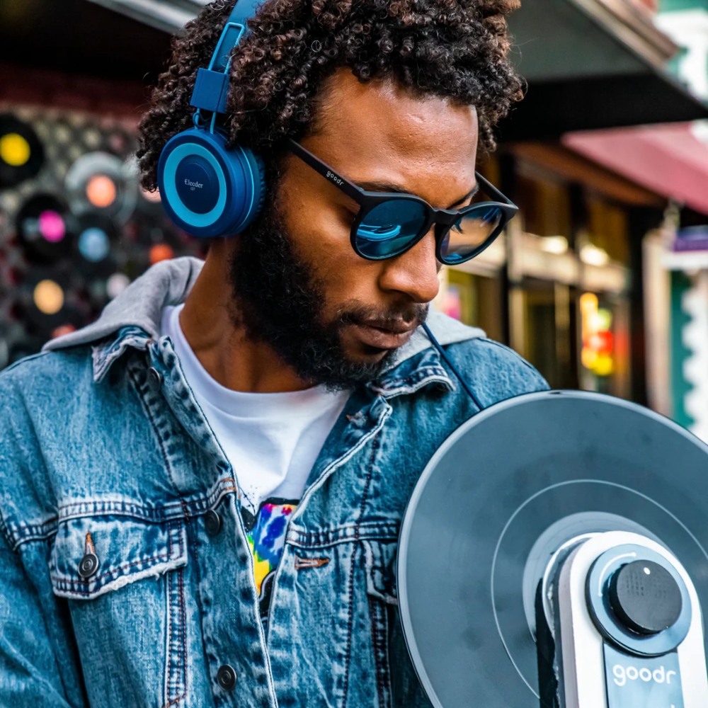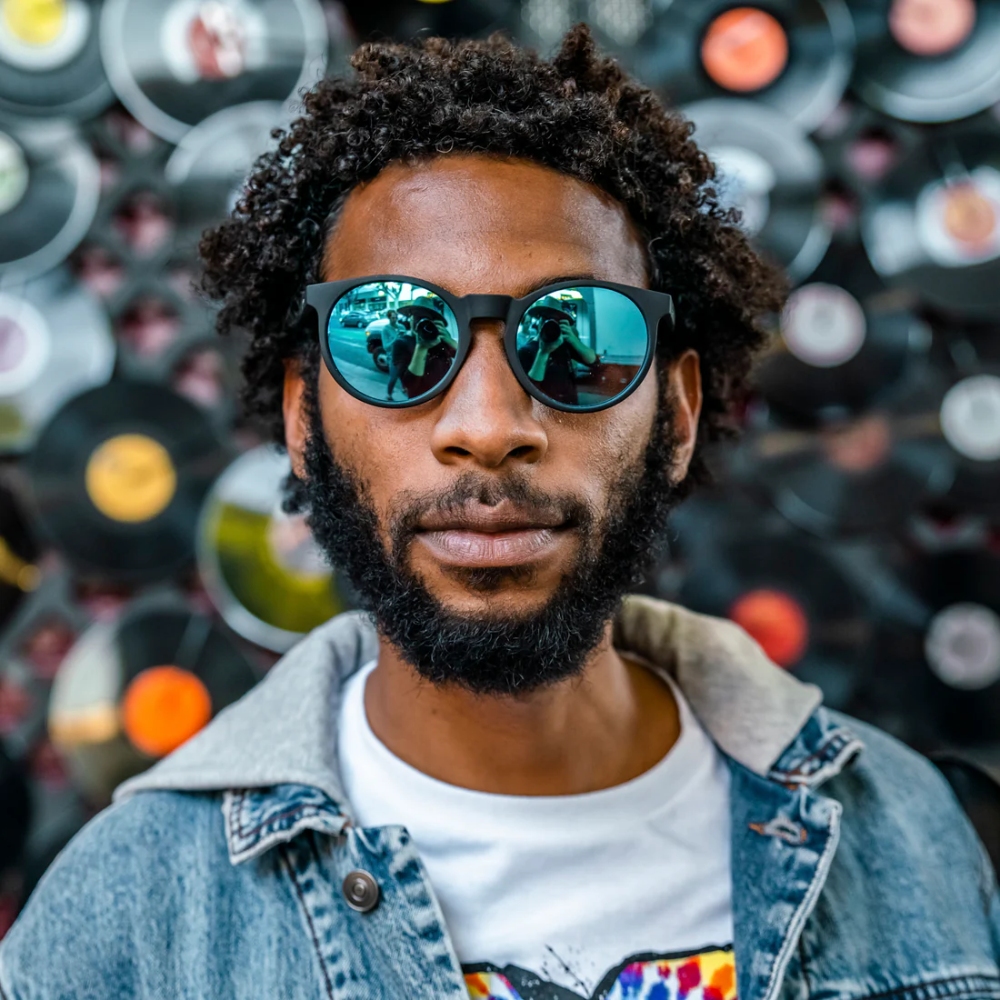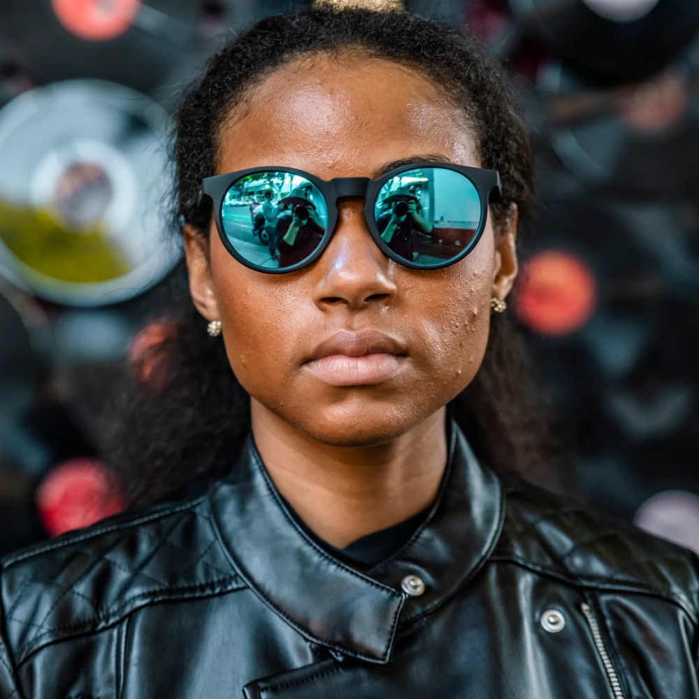 ・スポーティなブラックフレーム×ミラーブルーの丸型サングラス。