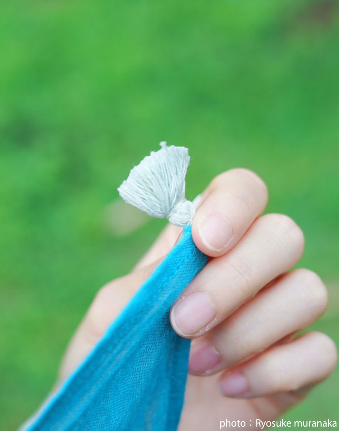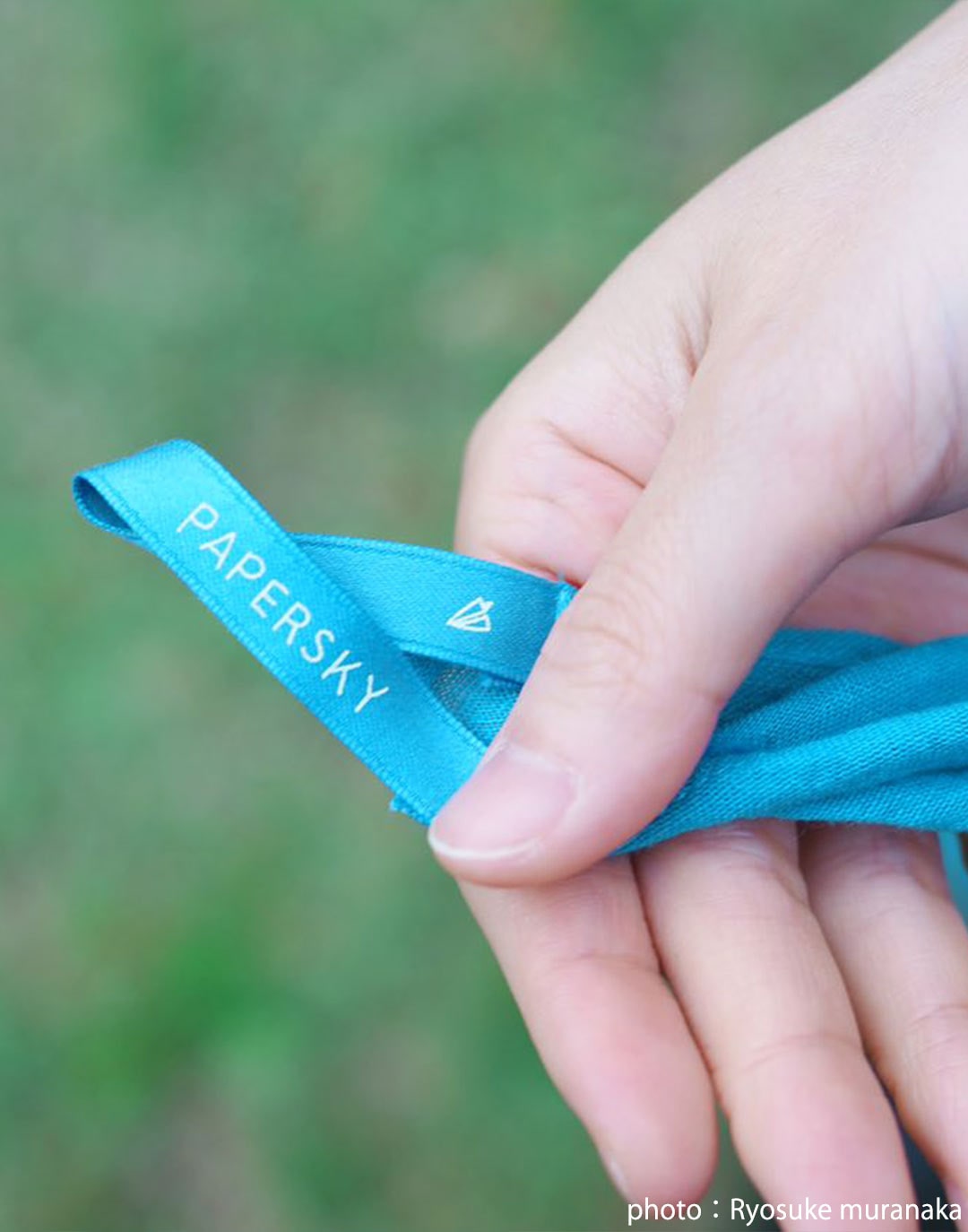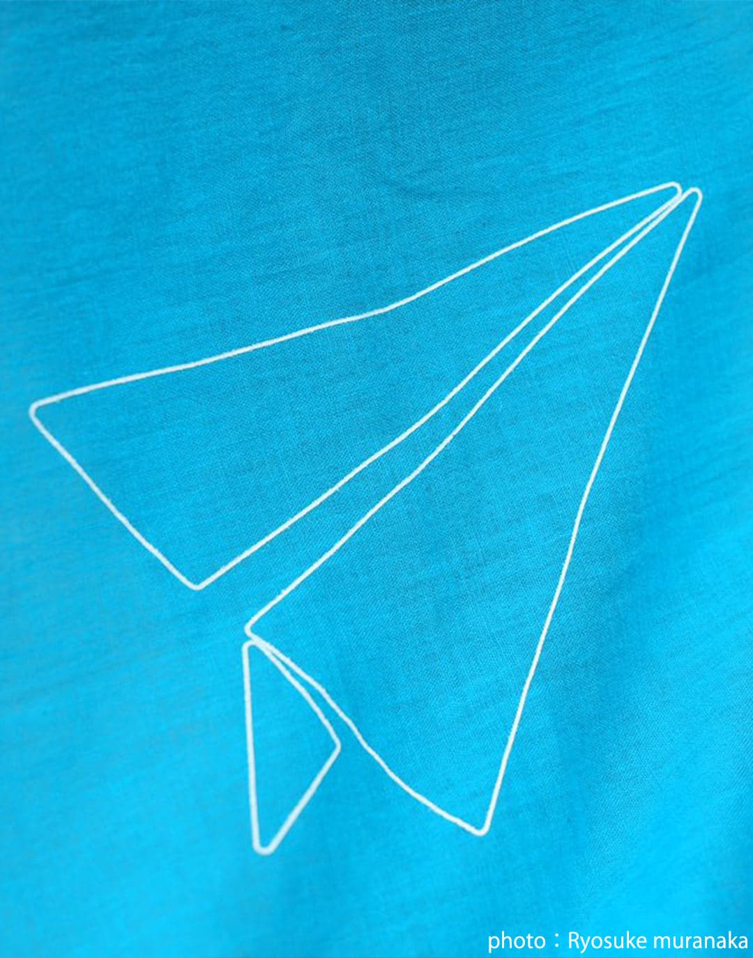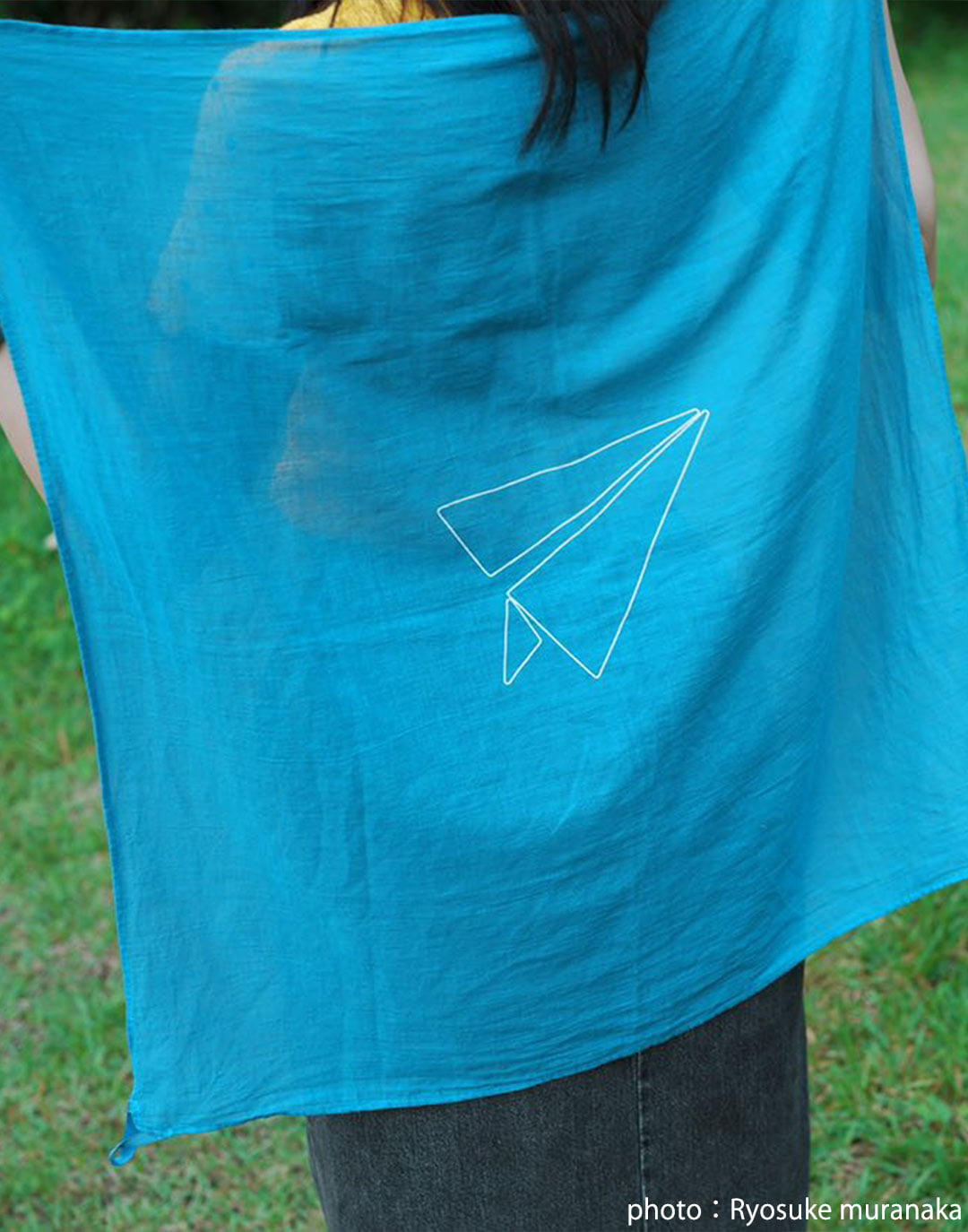 中央にはPAPERSKYの紙飛行機ロゴのライングラフィックをプリント。また、aoにゆかりのある新潟・糸魚川の藍で染めたタッセルは、旅のお守りチャームに。タグはフックに掛けられるようにデザイン。首に巻いてストールとしても使用可能。