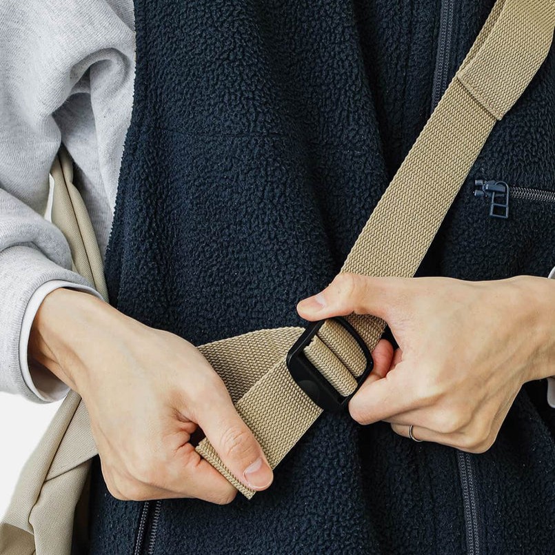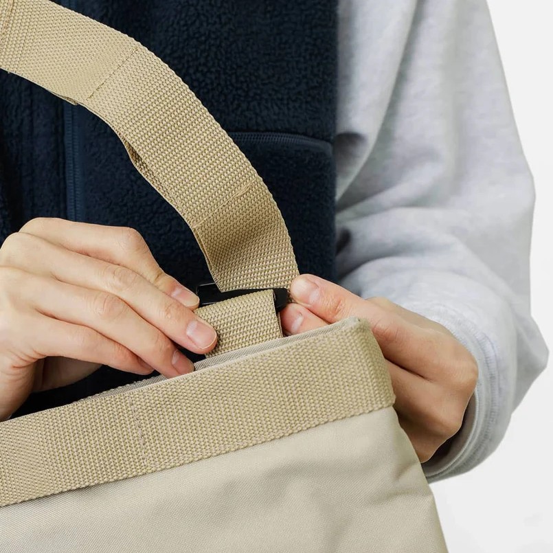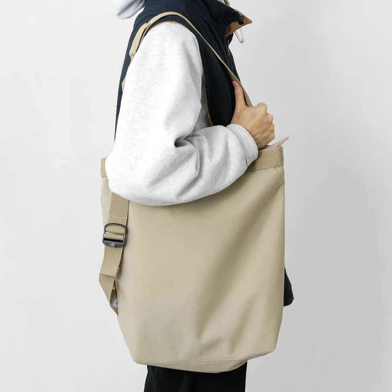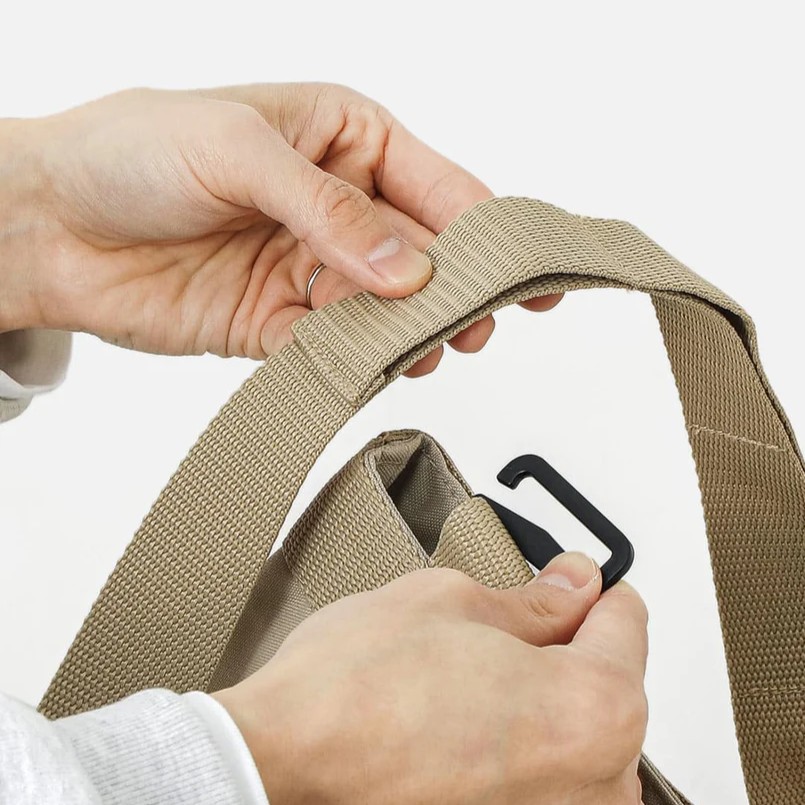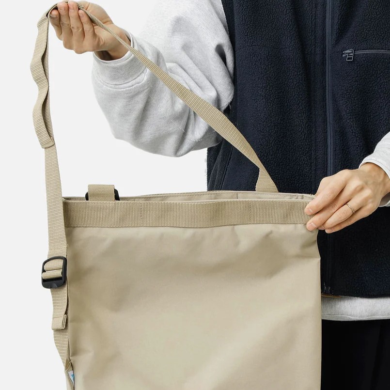 独自のテンションフック機構を採用した多用途バッグ。バッグ開口部に装着されたテンションフックに持ち手のループを掛けることでワンショルダーのトートバッグに。ループが3つ連なってるので、お好みの長さでお使いいただけます。