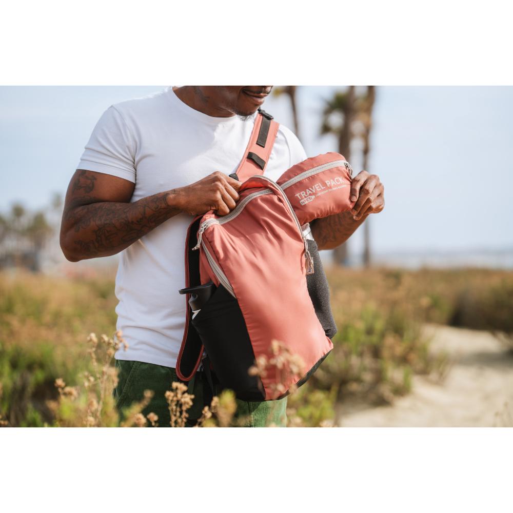 この快適で軽量なトラベルバックパックは、日帰りハイキングにも、世界中を旅するのにも最適で、スーツケースに入れたり、機内持ち込み手荷物にクリップで留めたりすれば、到着時にはバックパックとして使えます。重さはわずか7オンスで、荷物がかさばる心配もなく、必要な時には15Lの追加パックを持つことができます。大容量15Lのメインコンパートメント、伸縮性のあるサイドボトルポケット、トップスタッシュポケットを備えたパッカブルバックパックで、調節可能で通気性に優れたショルダーストラップ、安定性を高めるスターナムストラップ、ハイドレーション用リザーバーの収納スペースで快適な背負い心地を提供します。また、急な登頂や旅行にももちろん対応するでしょう。ジッパー付きメインコンパートメントは、ギアやアクセサリーを安全に収納できる15Lの容量を確保できます。また、ジッパー付きポーチは外ポケットとしても使用でき、素早く取り出したい小物の持ち運びに便利です。ハイキングや観光、毎日の通勤など、さまざまなアクティビティに最適な軽量トラベルアクセサリーで、通気性の良いショルダーストラップと調節可能なスターナムストラップが快適性と安定性を高め、ユースからアダルトサイズまで最適なフィット感を提供します。GRS認証を受けた100%消費者使用後のリサイクル・ペットボトルから作られ、溶液(水なし)染色されているため、リサイクルされていない生地を従来の方法で染色するよりも、89%少ない水、63%少ないCO2、60%少ないエネルギーで染め上げています。