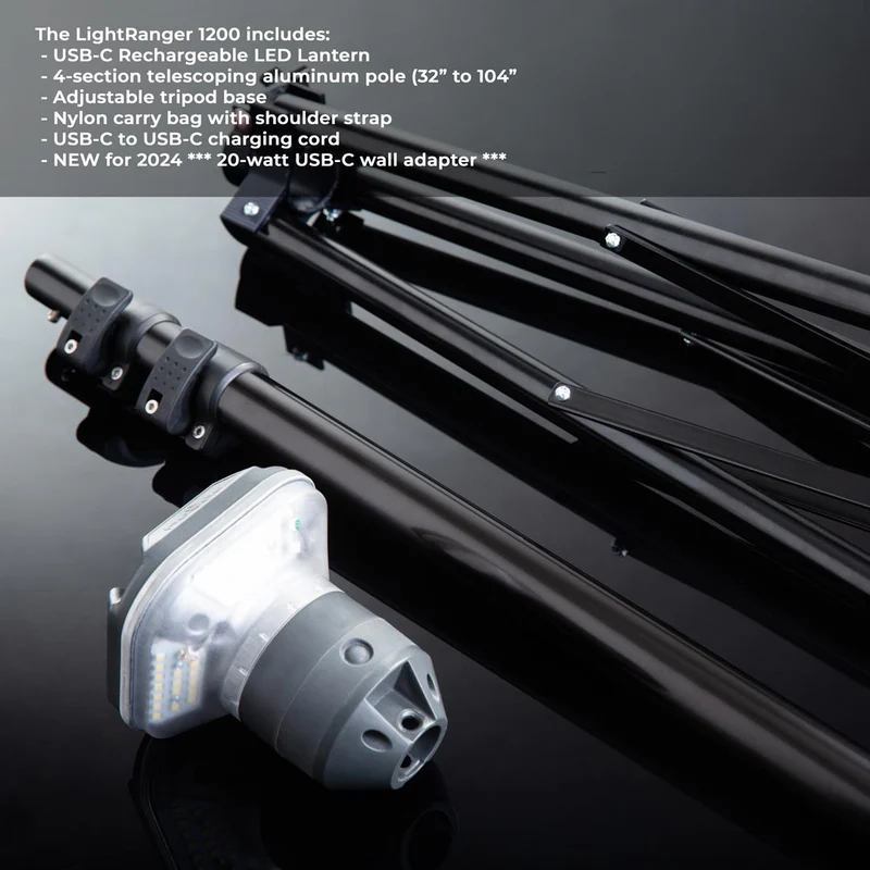 ・LightRanger 1200キットには、充電式ランタン、調整可能なポール、三脚ベース、キャリーバッグ、USB-C充電コード、そして2024年新登場の20ワットACアダプターが含まれています