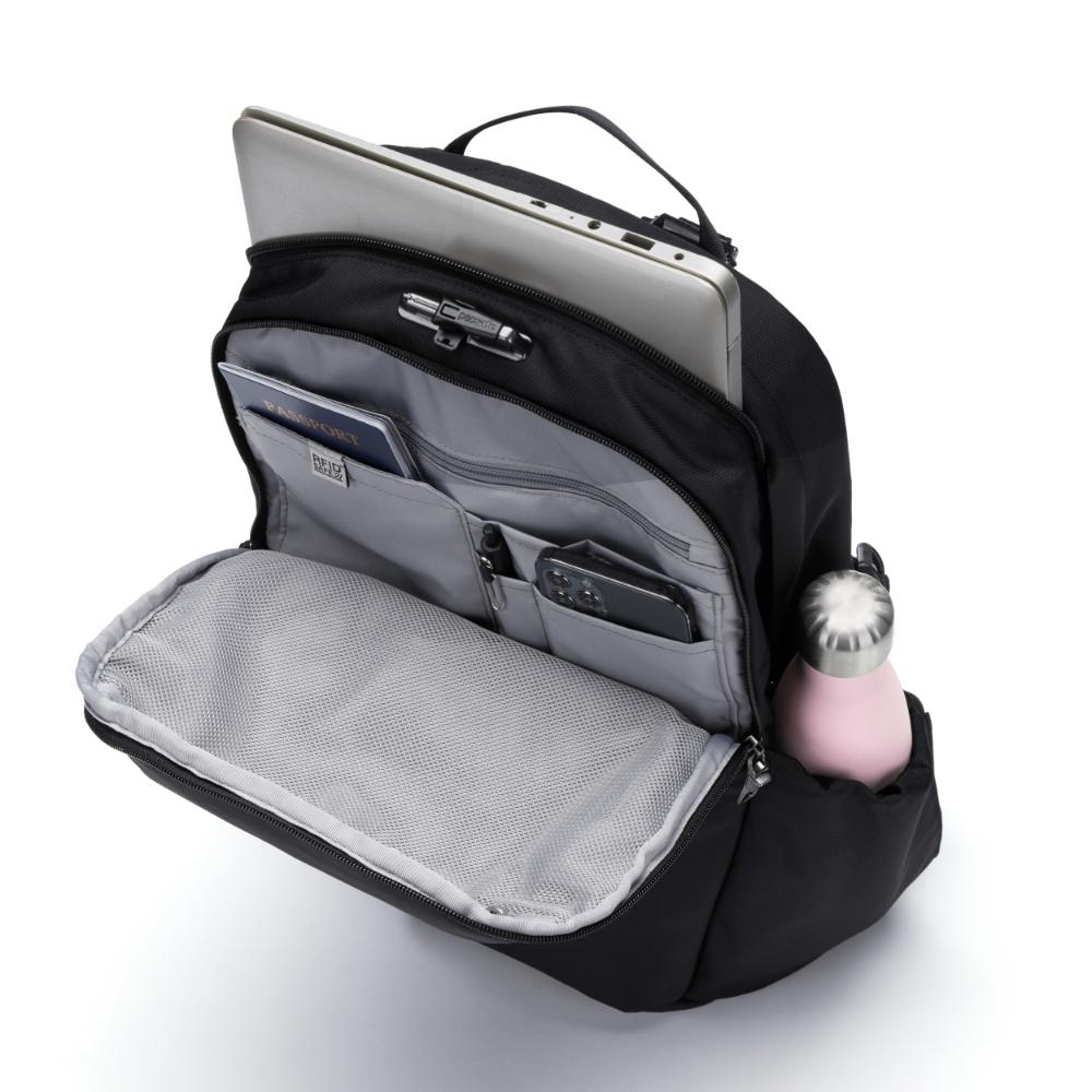 Pacsafe独自の盗難防止機能が搭載されたシンプルなデザインのバックパックです。シンプルながらも実用性に優れたデザインで、トラベルやビジネス、デイリーといった幅広いシーンに対応します。