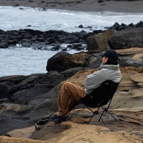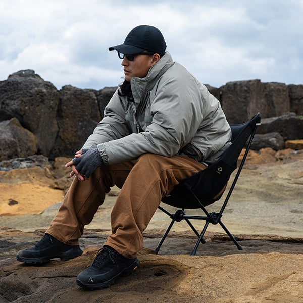 ヘリノックスのチェアは持ち運びに便利なコンパクトさが特徴のひとつ。故に、無駄を削いだデザインの中で座り心地の快適性を追求しています。袋から取り出して、脚部分を組み立てて座面のシートを取り付ければ、直ぐに座れる手軽な折りたたみ式です。