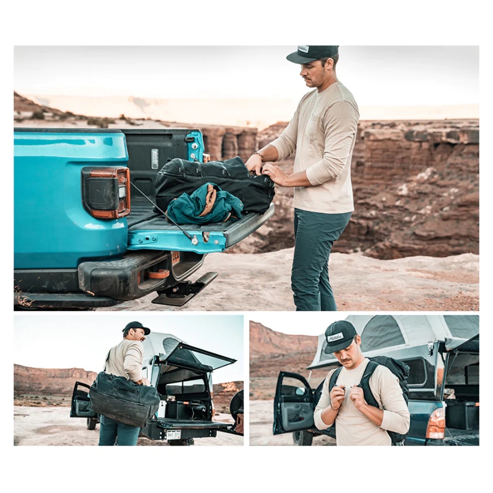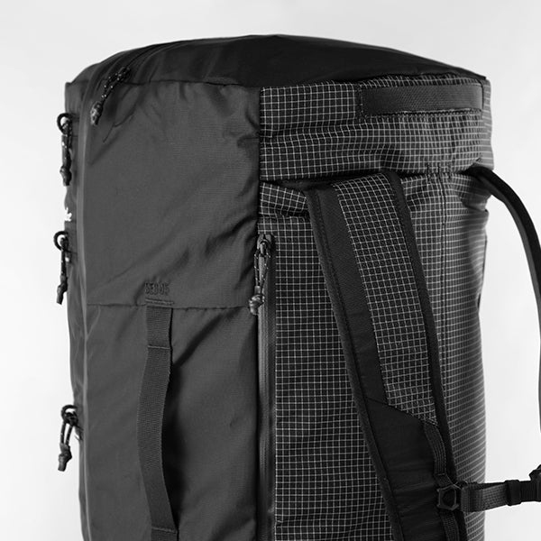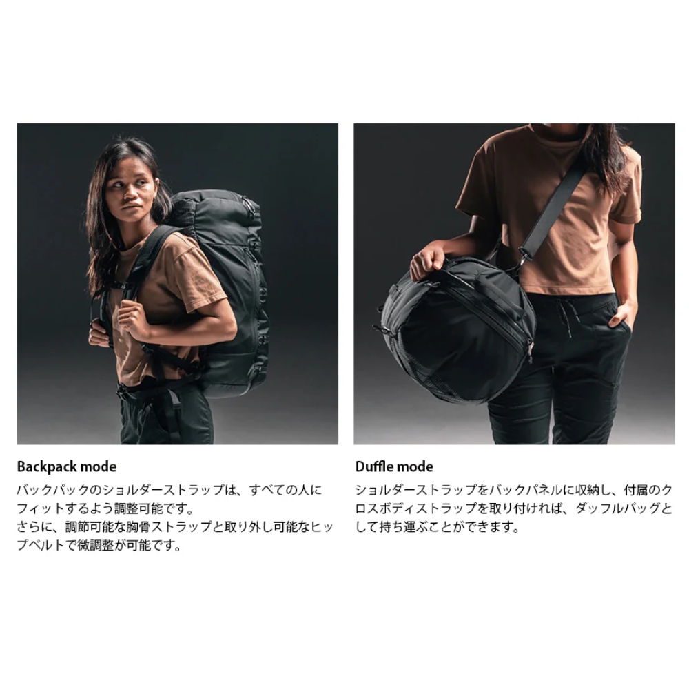 バックパックとして使用する際は、スムースな動きのショルダーストラップ、チェストストラップ、取り外し可能なシンプルなウェストストラップで調整してください。ダッフルバックとして使用する際は、ショルダーストラップの下の部分を外して背面に収納することができます。トップ、ボトム、サイドに丈夫なキャリーハンドルを装備していますので、持ち上げたり運んだりする際にストレスなくホールドできます。