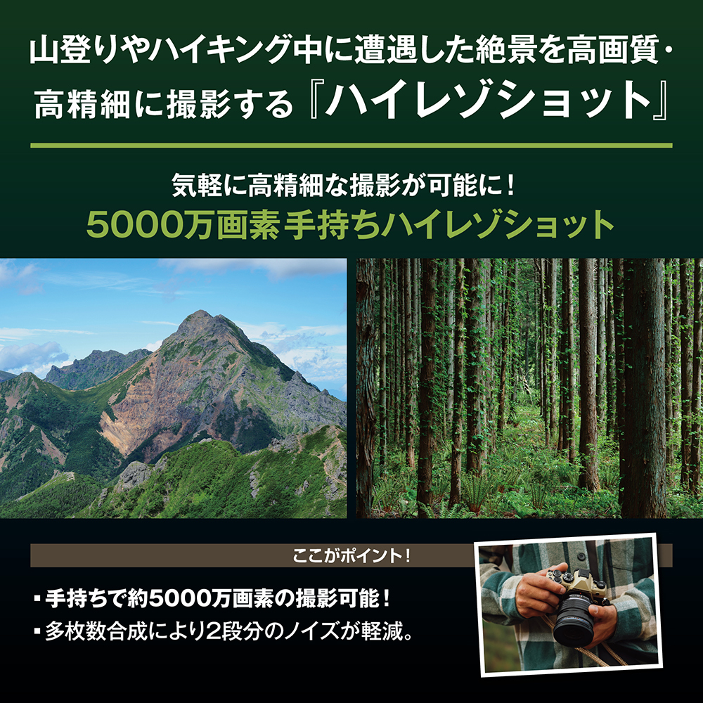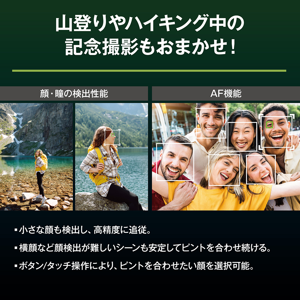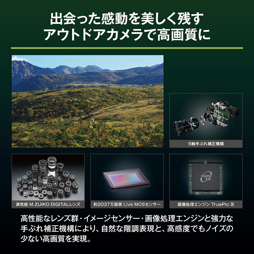 1. 小型軽量・高画質。アウトドアで体験したシーンを、単なる記録でなく、作品として鮮やかに写し、残すことができるアウトドアギアとしてのレンズ交換式カメラです。