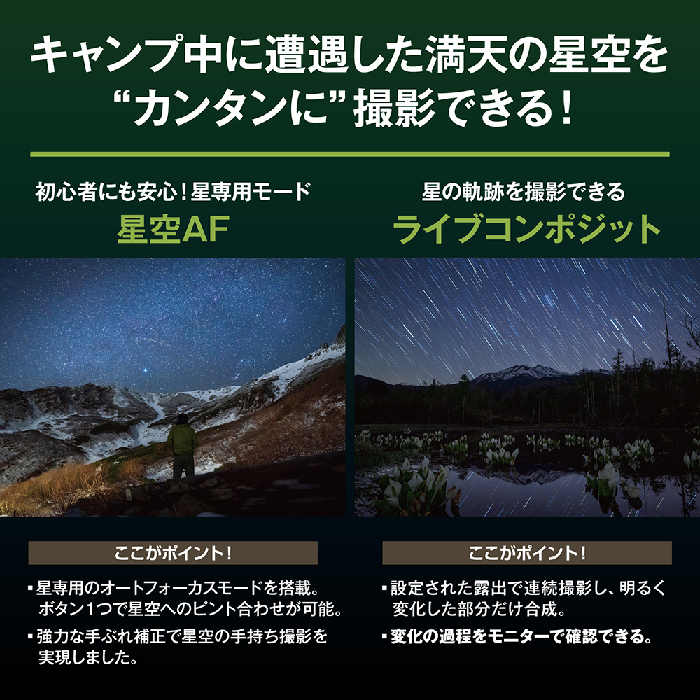 3. 心動かす体験を印象的に写す撮影機能。OM SYSTEMは、カメラ内で合成技術を処理するコンピュテーショナル フォトグラフィを搭載しており、撮影するだけで最新のデジタル技術を活用した写真表現が可能です。