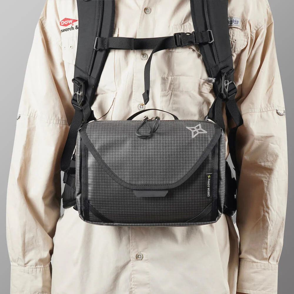行動中はチェストバッグとして使うことができます。重量をザックに分散し肩の負担を減らせます。