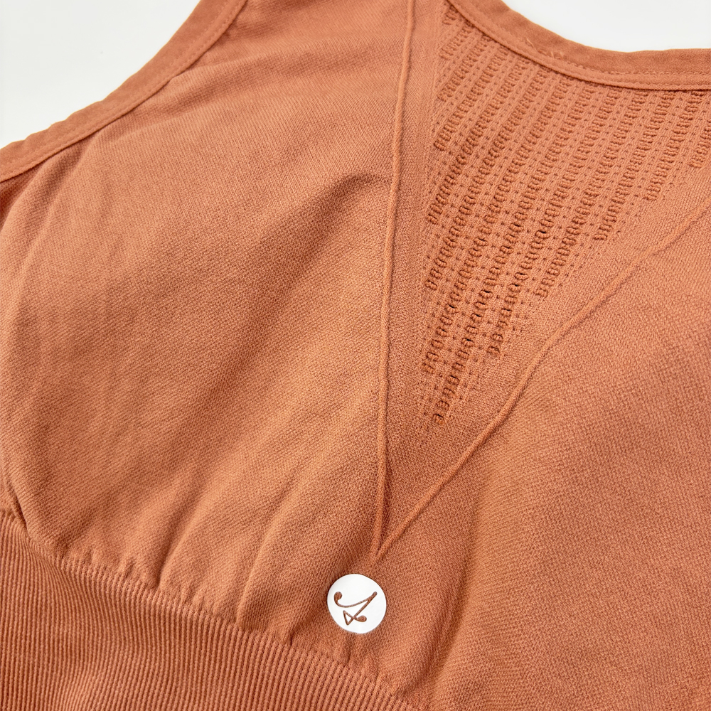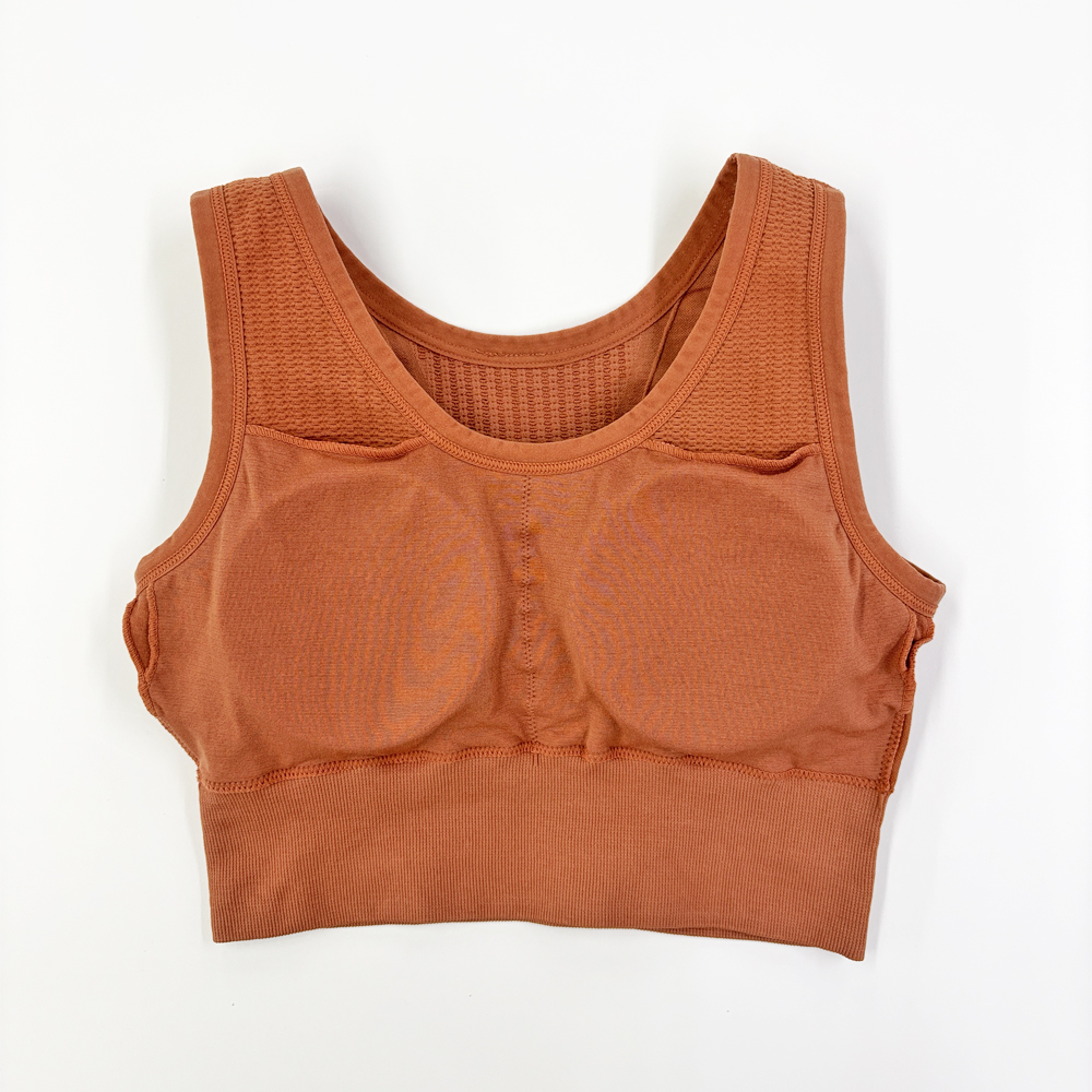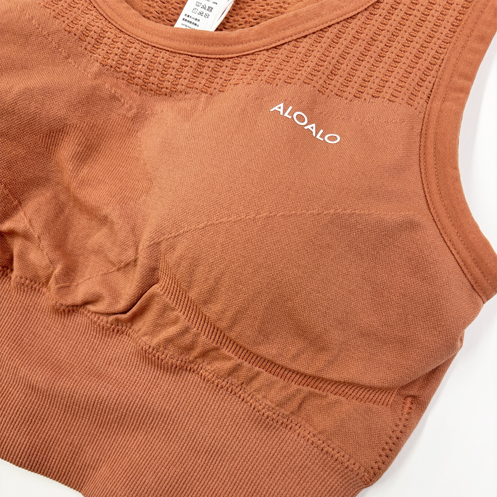- 通気性バツグンなメッシュ状の編地を前後に採用したスポーツブラ。