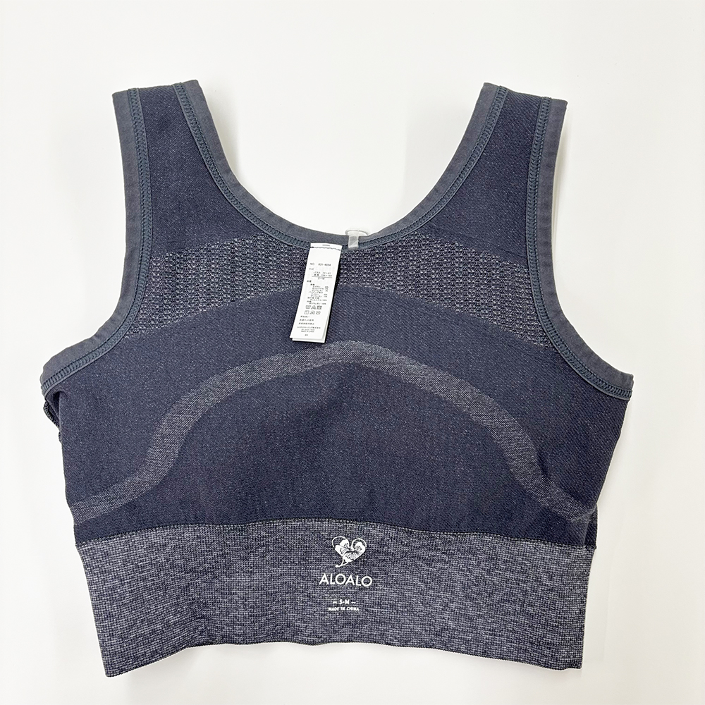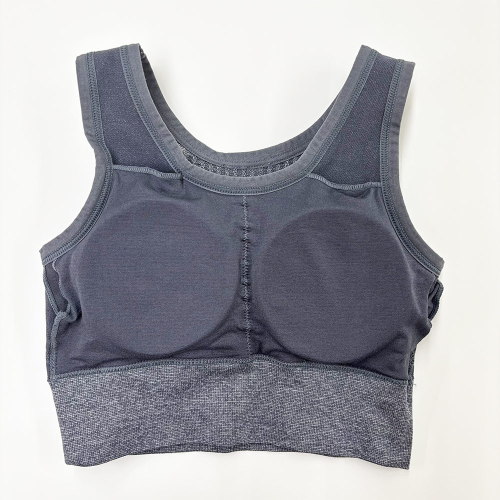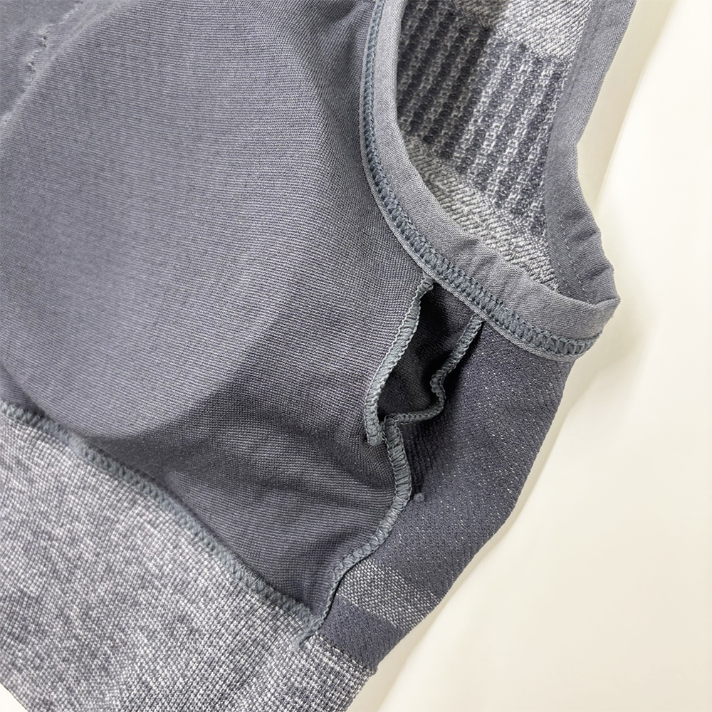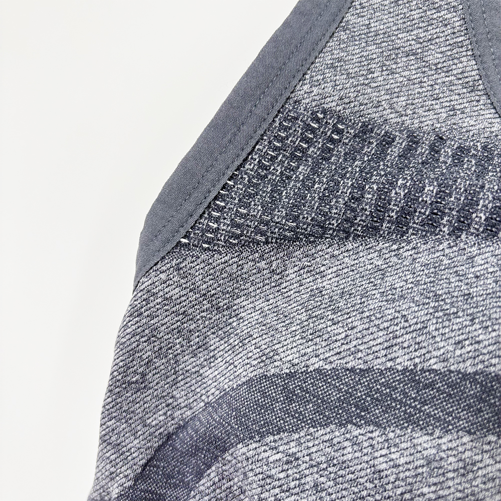 - ジャカード編みで表現された陰影の柄と随所のメッシュ状の編地がポイントのスポーツブラ。