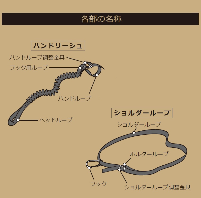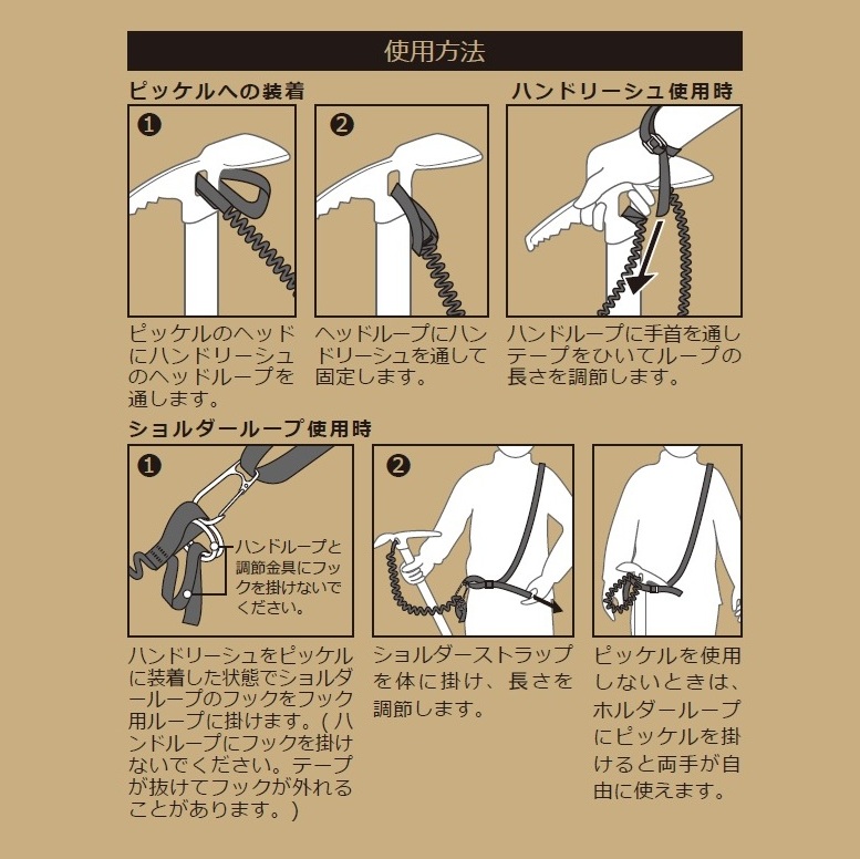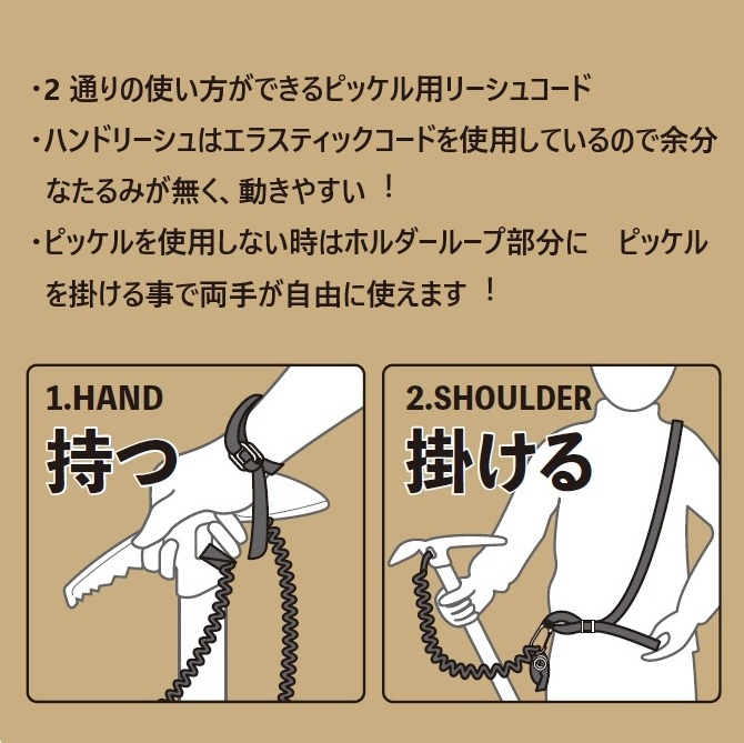 ハンドリーシュは単体で使用可能。付属のショルダーループと連結する事でピッケルの紛失防止になる2WAY仕様。