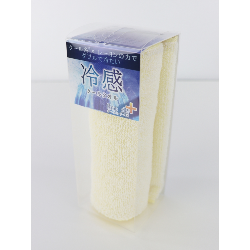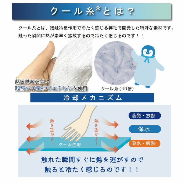 クール糸とレーヨン糸を使用した接触冷感マフラーです。表面に触れるだけで冷たく感じられ、エアコンや扇風機の補助としてもお使いいただけるのでエコにもつながります。普段使いのタオルとしてもご使用できます。