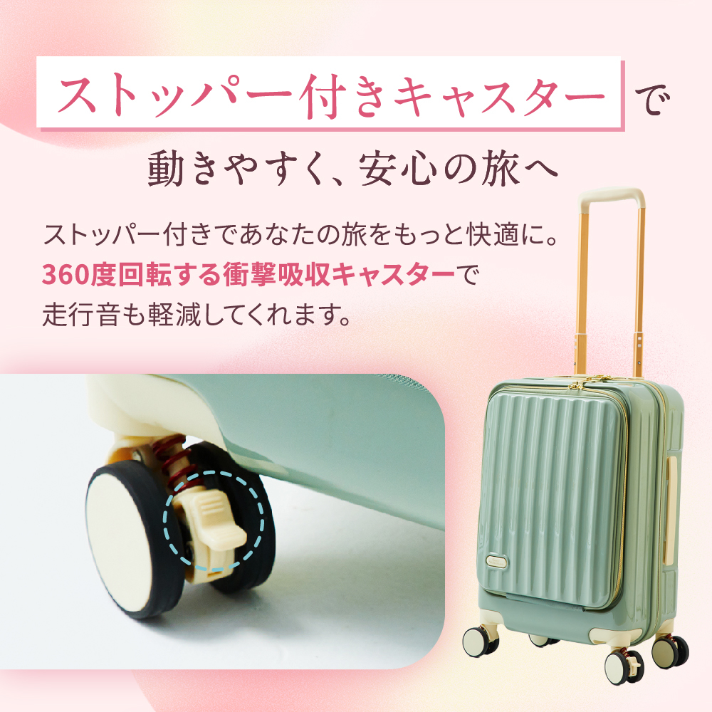 発色の良い艶のある加工を施したボディーにUSB付のTSAロックや、静音のストッパー付きダブルキャスターなどを備える。