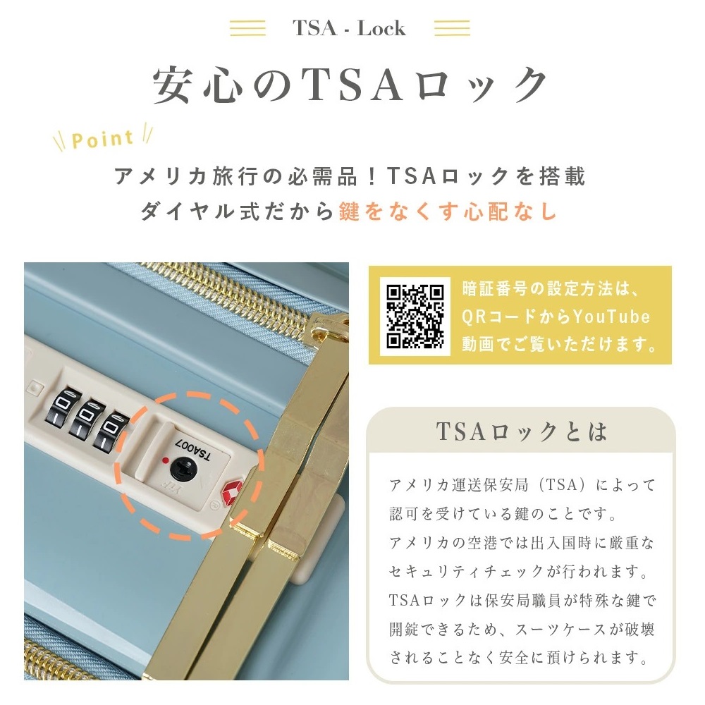発色の良い艶のある加工を施したボディーにUSB付のTSAロックや、静音のストッパー付きダブルキャスターなどを備える。